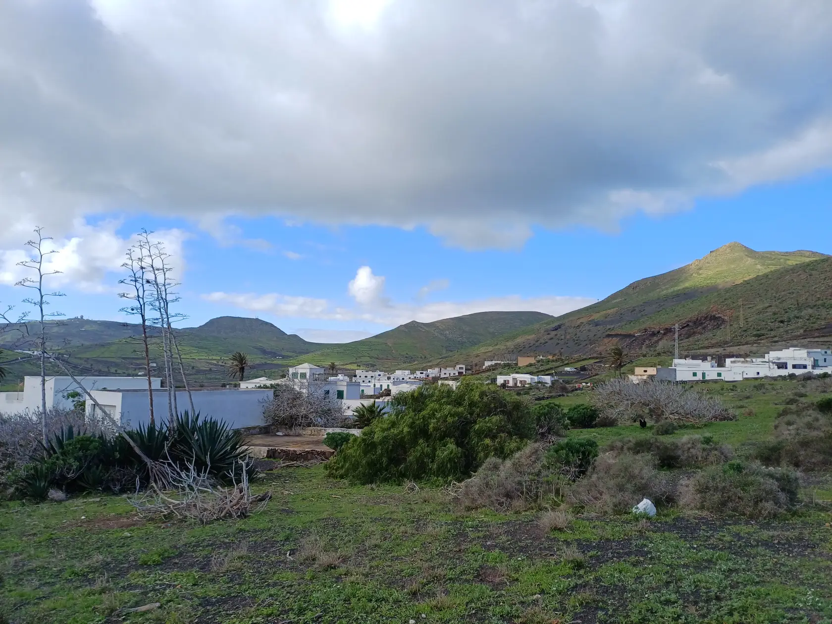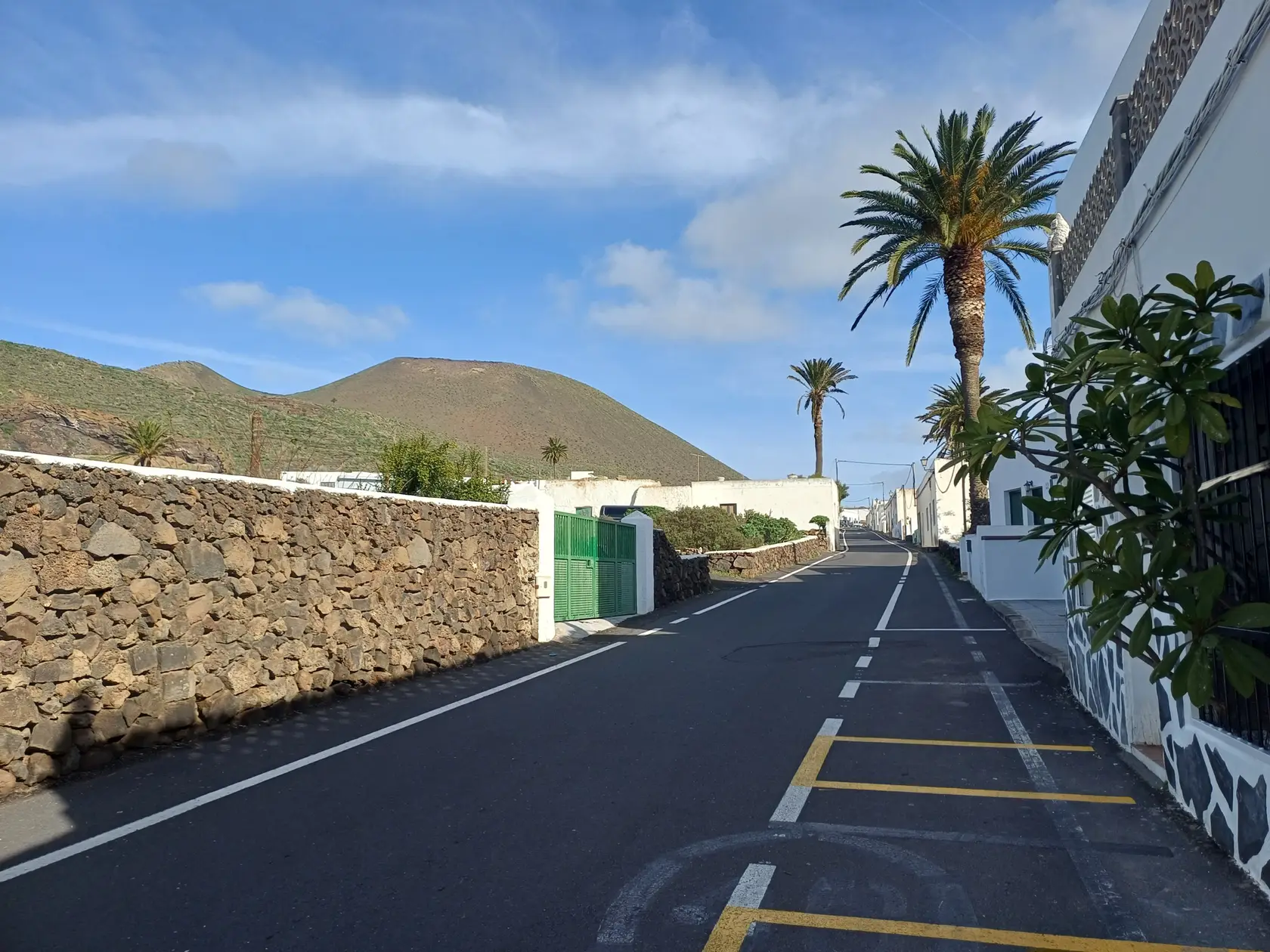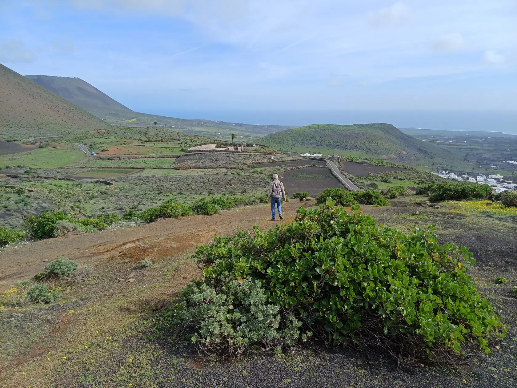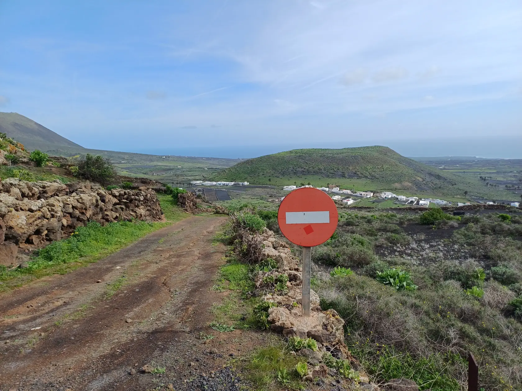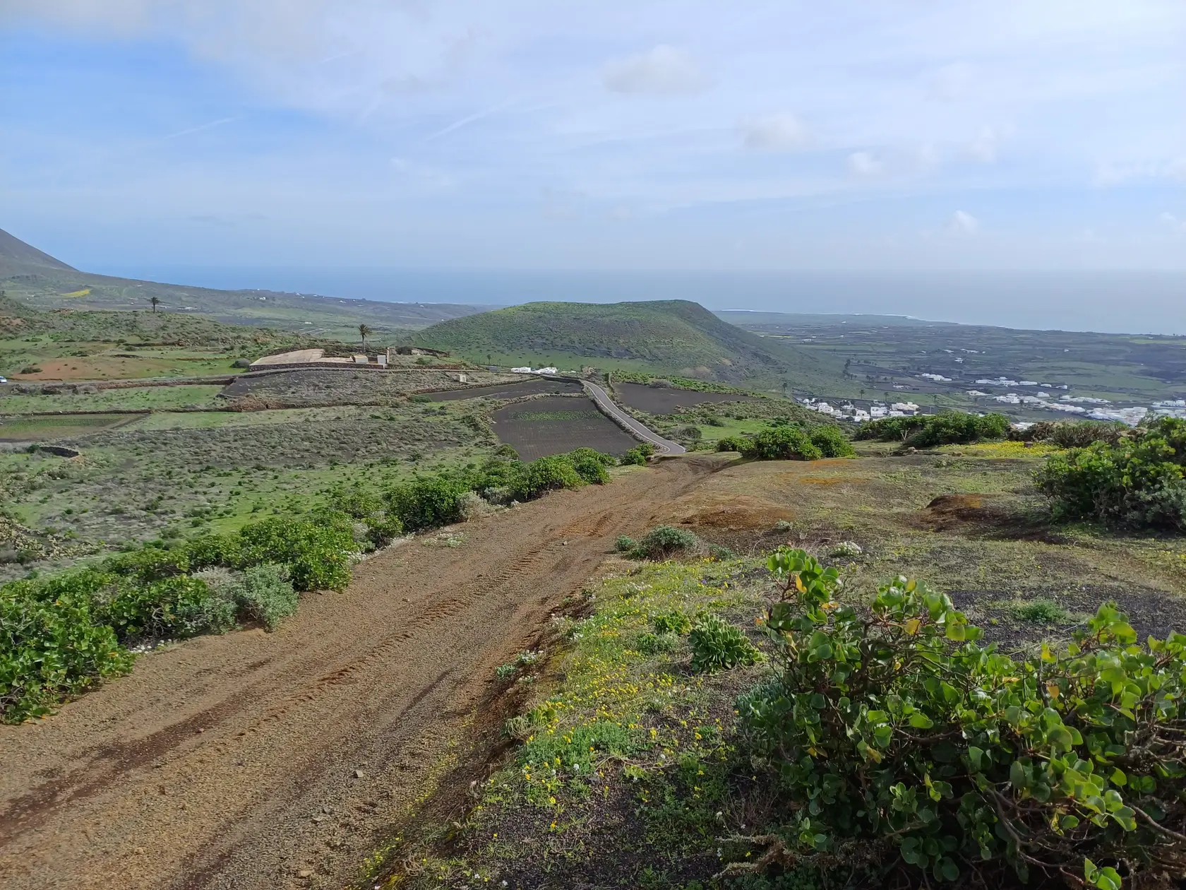 Östlich der Ortsdurchgangsstraße wird bergauf Richtung Norden durch den Ort geschlendert bis zur Weggabelung, an der rechts in die Piste „Calle Cuerva“ abgebogen und an den letzten Häusern der Ortschaft vorbei spaziert wird. Nun geht es auf dieser Piste stets leicht aufwärts Richtung Monte Corona. Am Fuß des Monte Corona biegen wir nach links in die nicht zu übersehende Piste Richtung Guinate. Kurz nach der Überquerung der LZ 101 biegen wir in die nächste, ebenfalls nicht zu übersehende Piste nach links ab. Nun geht es eine Weile aufwärts bis zum Rand des Famara-Massivs mit wunderbarer Weitsicht nach Timanfaya Richtung Süden und zu den vorgelagerten Inseln Richtung Norden. An einer markanten Weggabelung halten wir uns links Richtung Osten und kommen an der runden Wetterstation der Gemeinde Haría vorbei. Die Piste wird nun zu einer asphaltierten Straße, die in Serpentinen bergab nach Máguez führt. Hinter zwei Spitzkehren kann auf steileren Schotterpisten die Wegstrecke abgekürzt werden – das haben wir gemacht.
