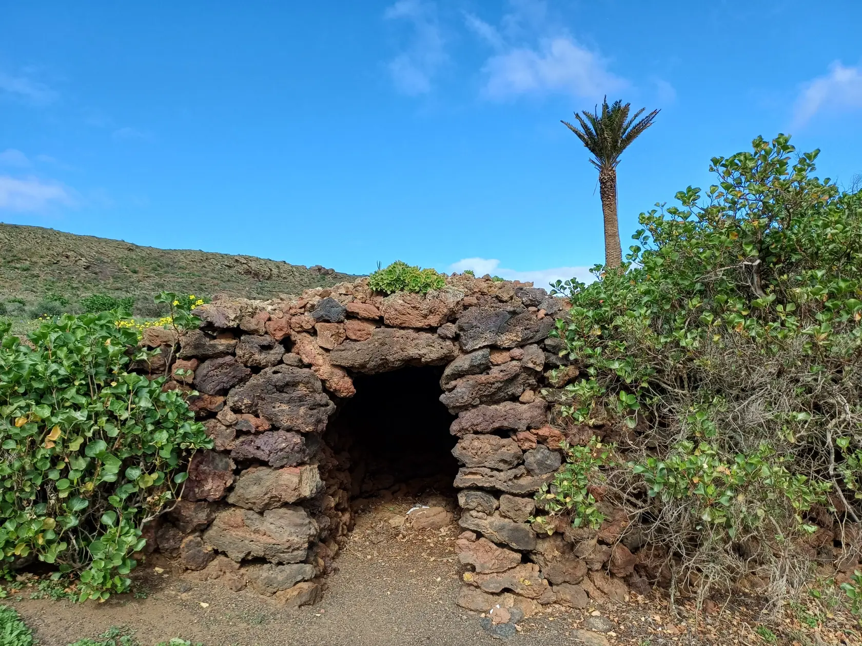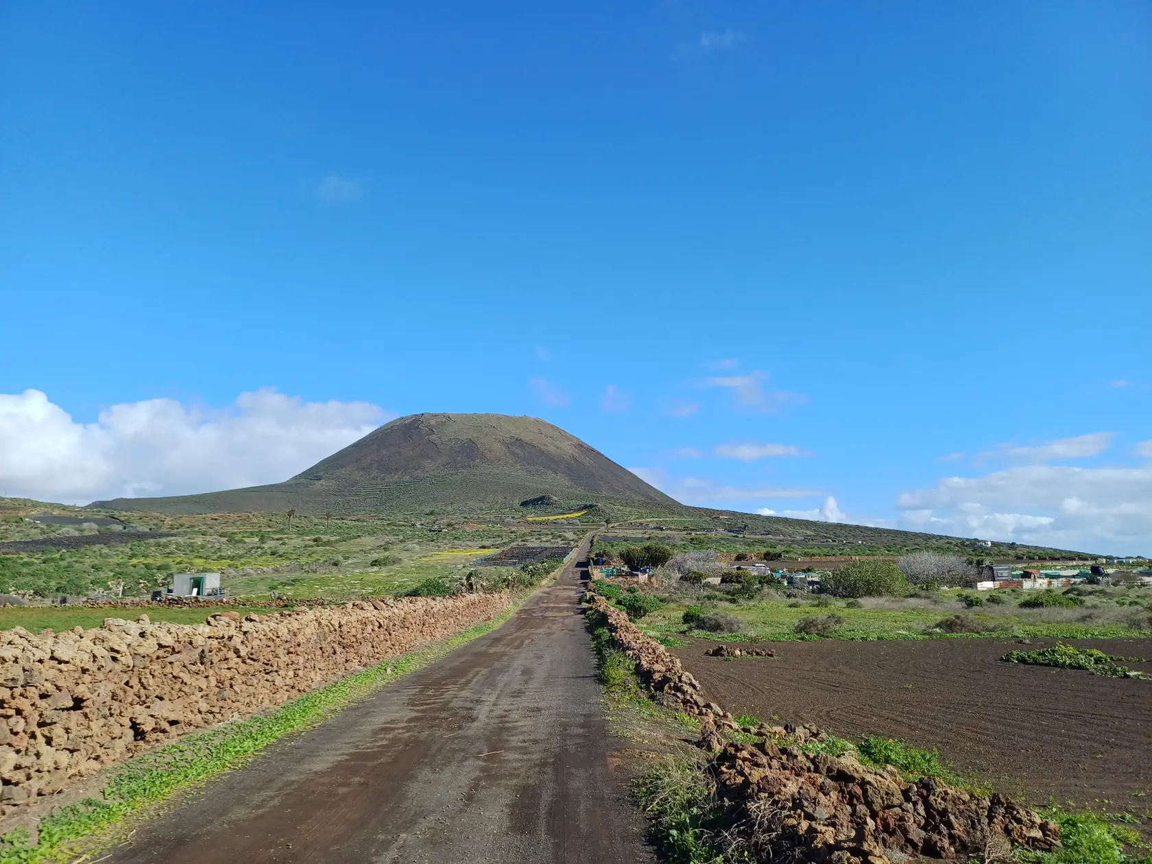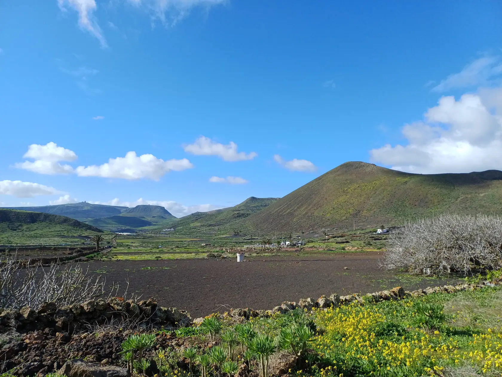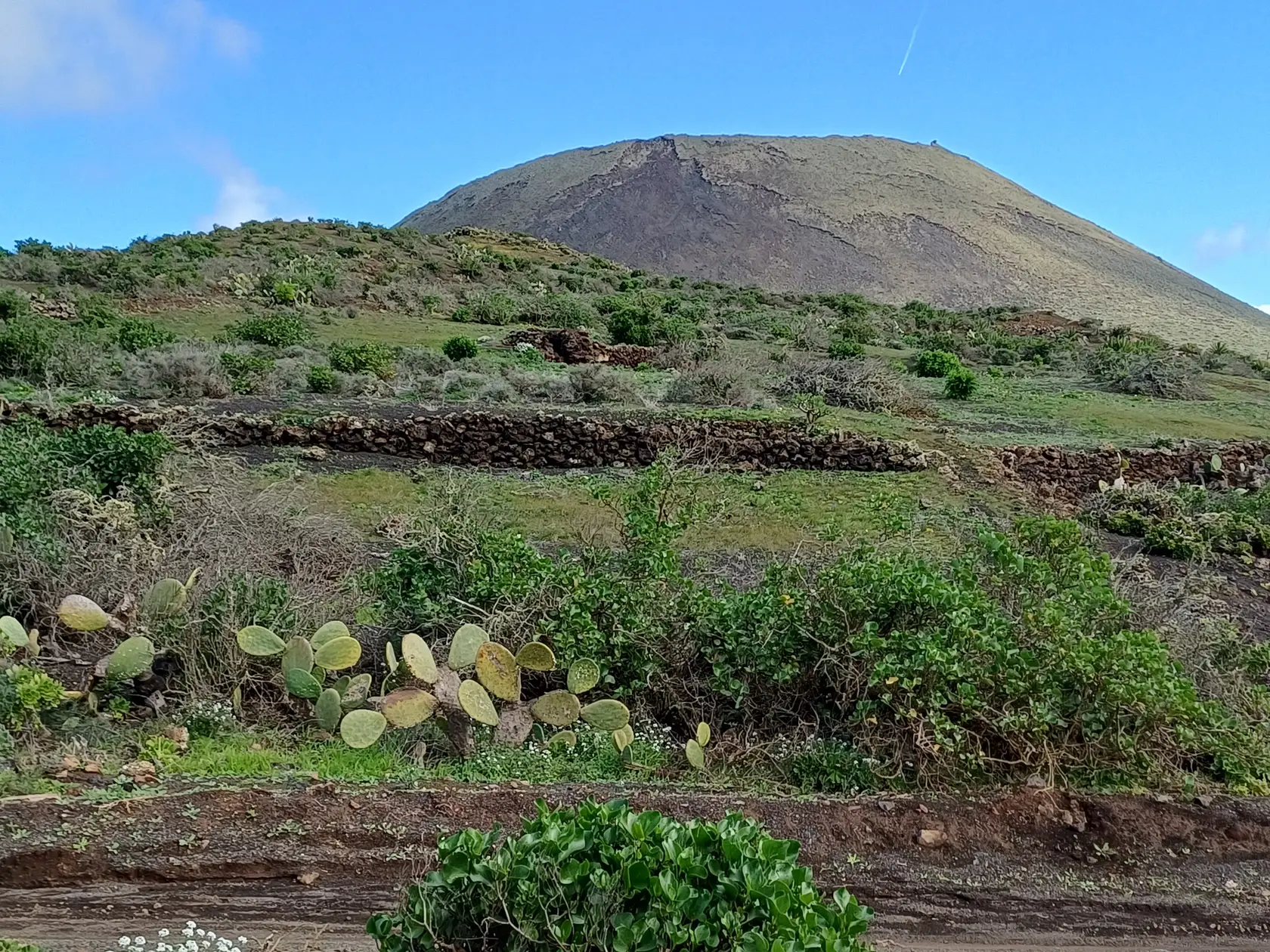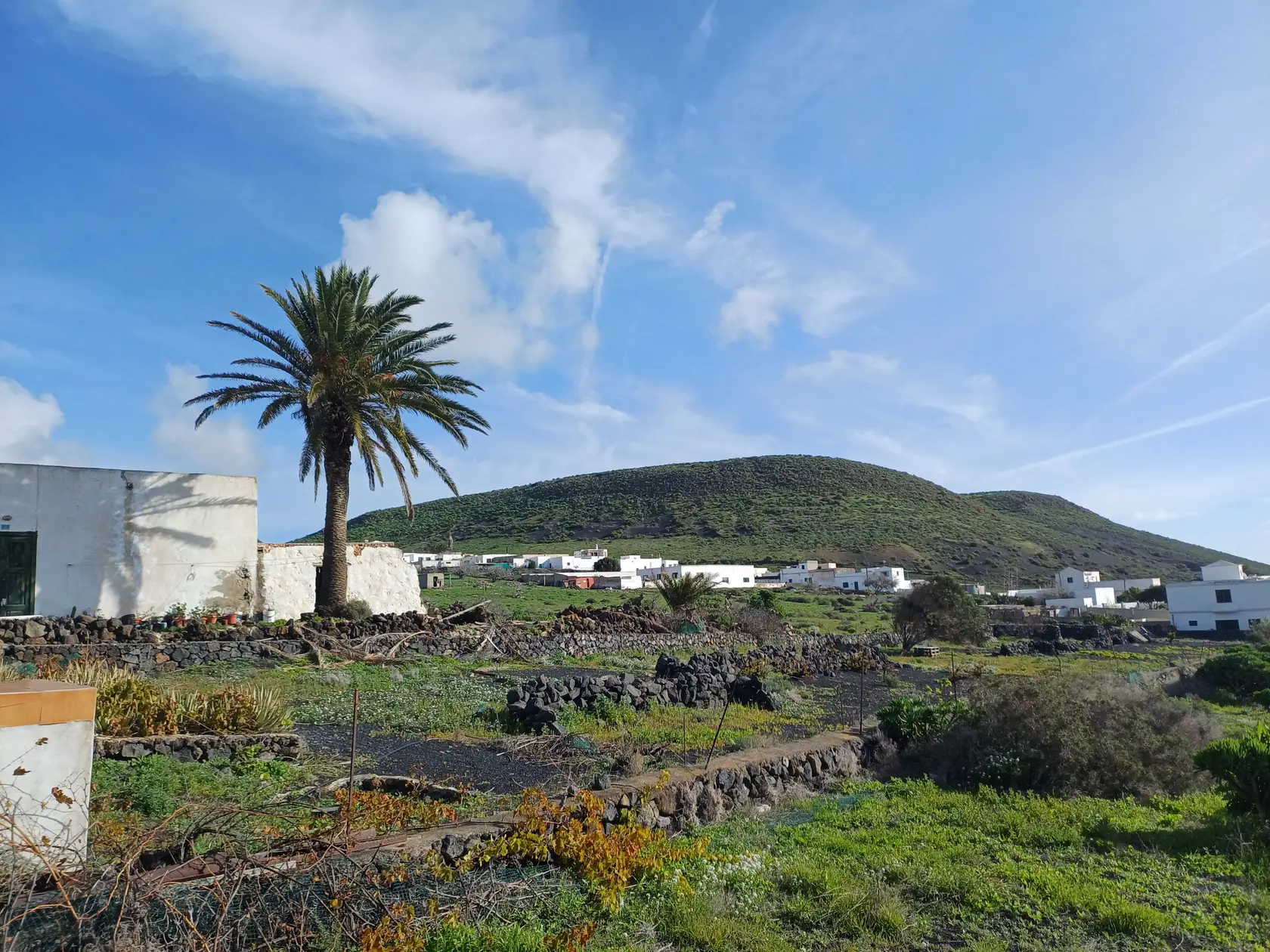 Östlich der Ortsdurchgangsstraße wird bergauf Richtung Norden durch den Ort geschlendert bis zur Weggabelung, an der rechts in die Piste „Calle Cuerva“ abgebogen und an den letzten Häusern der Ortschaft vorbei spaziert wird. Nun geht es auf dieser Piste stets leicht aufwärts Richtung Monte Corona. Am Fuß des Monte Corona biegen wir nach links in die nicht zu übersehende Piste Richtung Guinate. Kurz nach der Überquerung der LZ 101 biegen wir in die nächste, ebenfalls nicht zu übersehende Piste nach links ab. Nun geht es eine Weile aufwärts bis zum Rand des Famara-Massivs mit wunderbarer Weitsicht nach Timanfaya Richtung Süden und zu den vorgelagerten Inseln Richtung Norden. An einer markanten Weggabelung halten wir uns links Richtung Osten und kommen an der runden Wetterstation der Gemeinde Haría vorbei. Die Piste wird nun zu einer asphaltierten Straße, die in Serpentinen bergab nach Máguez führt. Hinter zwei Spitzkehren kann auf steileren Schotterpisten die Wegstrecke abgekürzt werden – das haben wir gemacht.