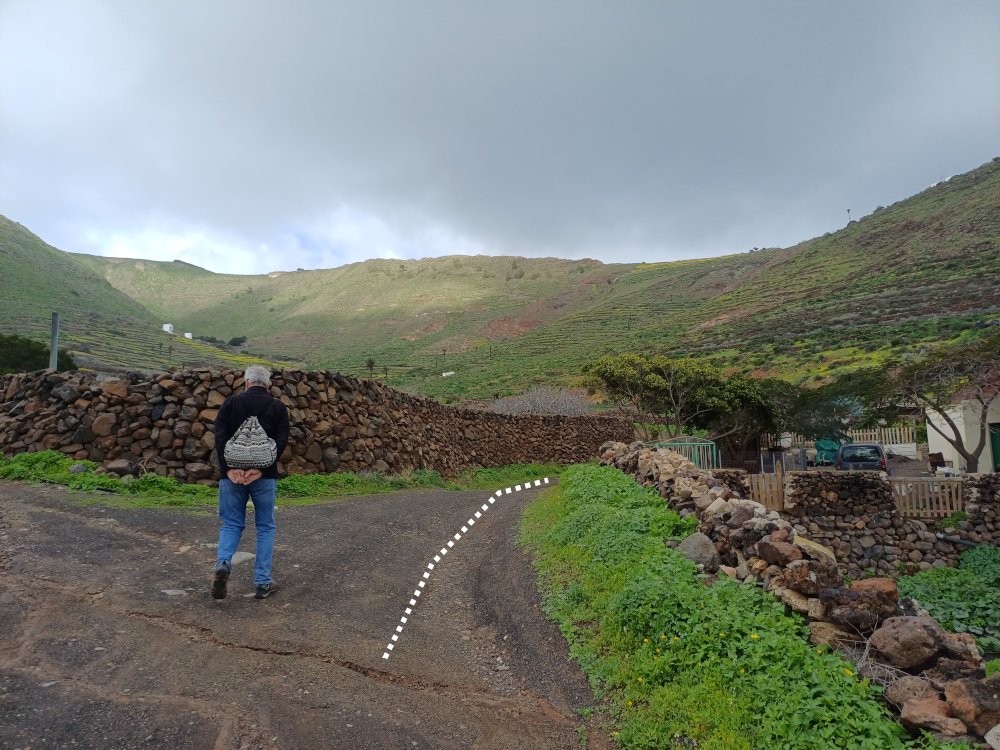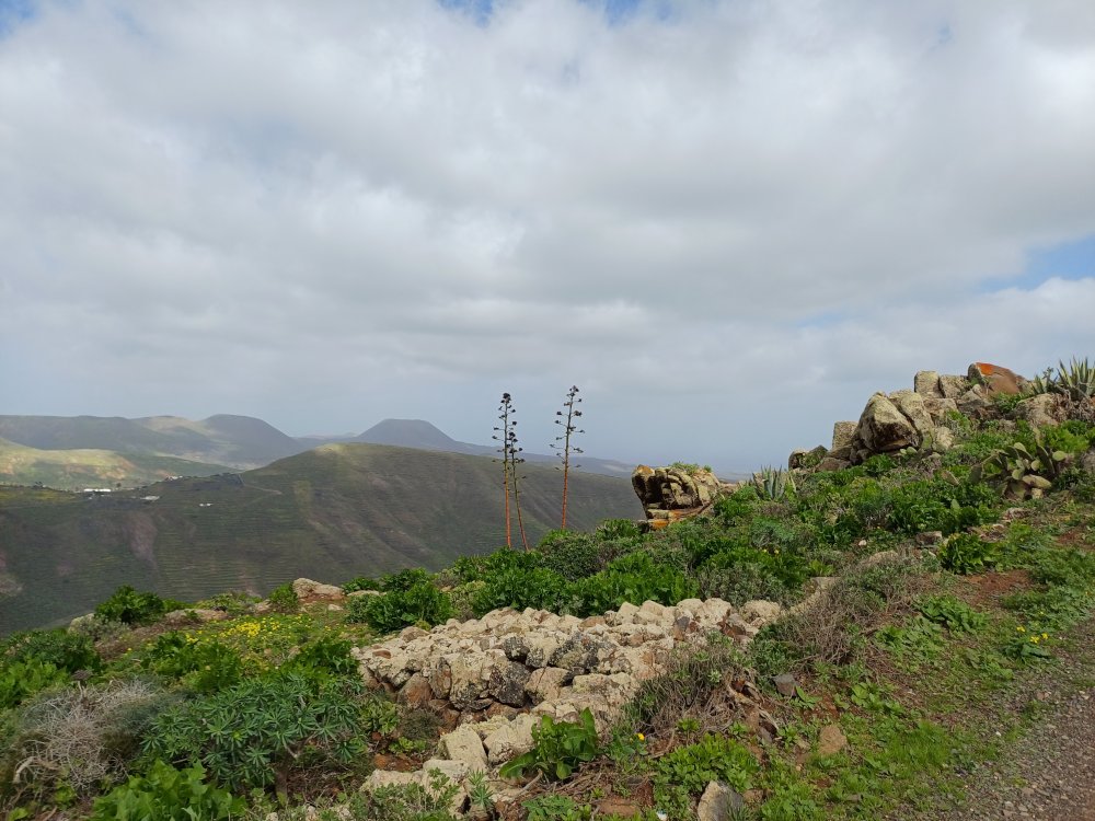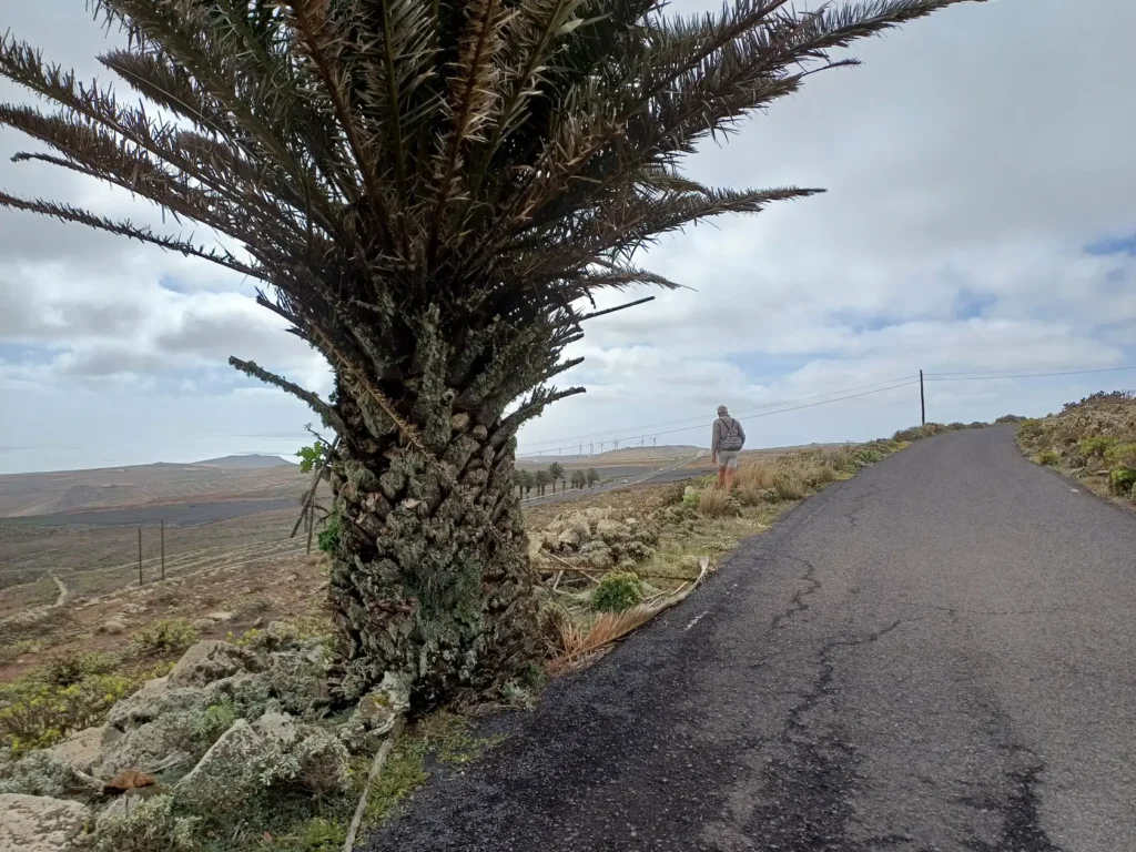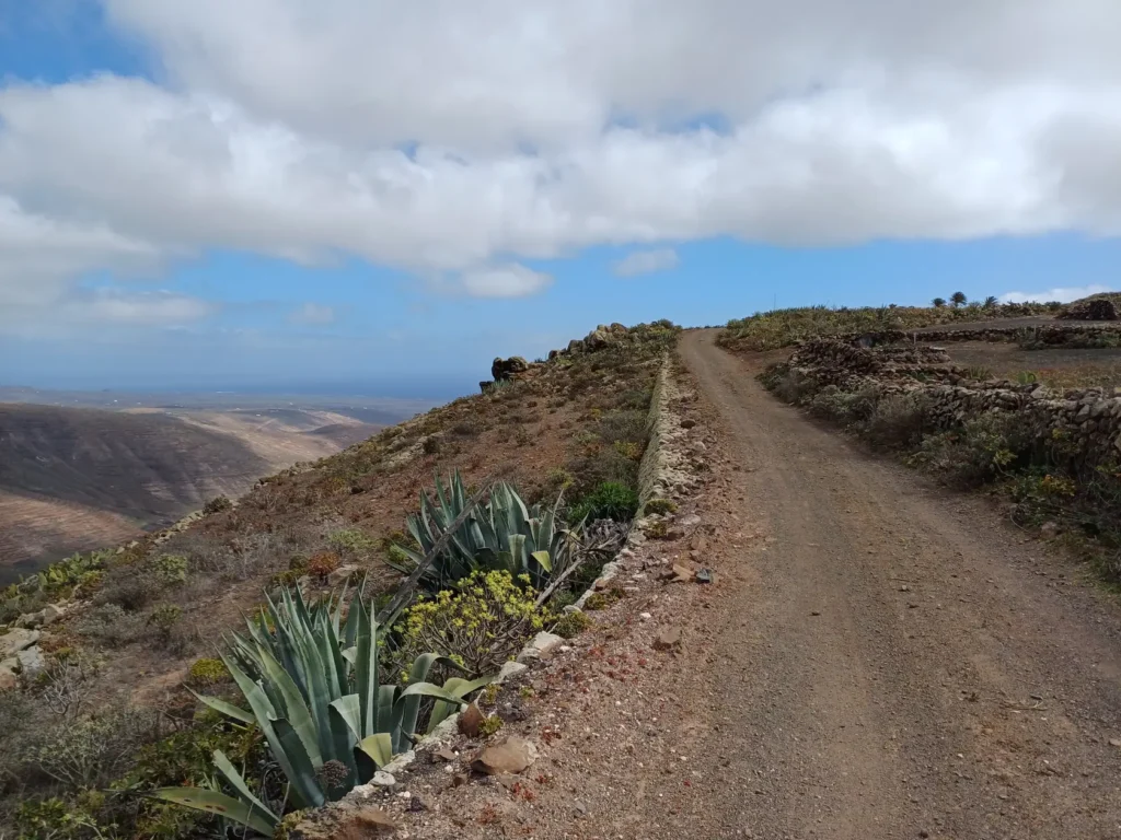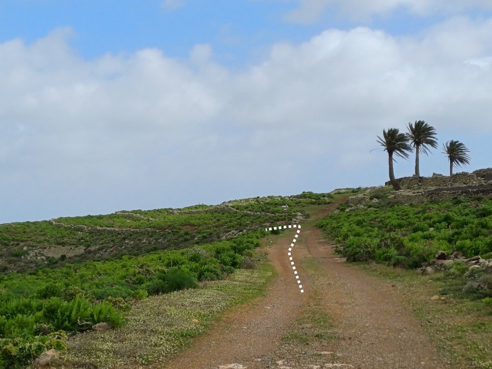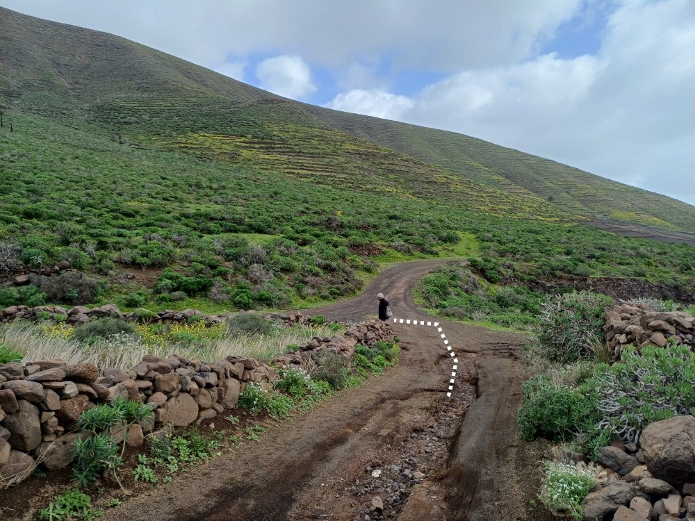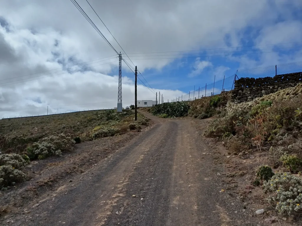 Schräg gegenüber vom Parkplatz geht es auf einem breiten Weg zunächst bergab bis zu einer Kreuzung. Dort links abbiegen und dem Weg aufwärts bis zur nächsten Abzweigung folgen, an der der Weg nach links knickt und es nach rechts auf einen Pfad geht. Dieser Pfad ist der Aufstiegspfad nach Haría, dem wir folgen. In Serpentinen geht es nun weiter bergauf. Der Pfad mündet in der LZ-207, wo wir uns links halten, um in die LZ-210 zu biegen, und dort in die ausgeschilderte Richtung Teguise & Arrecife.