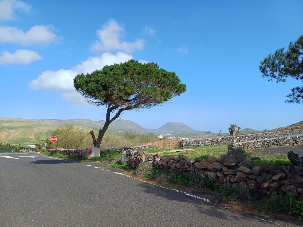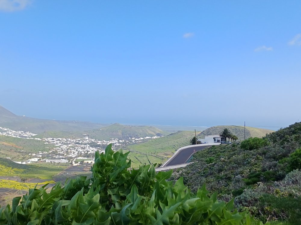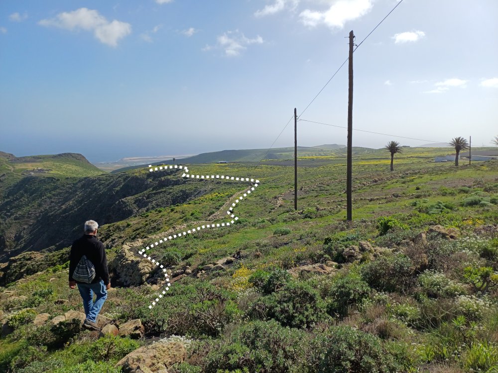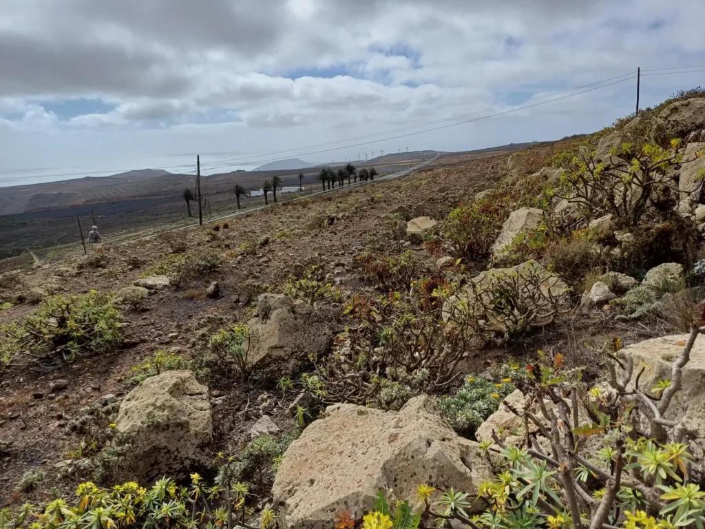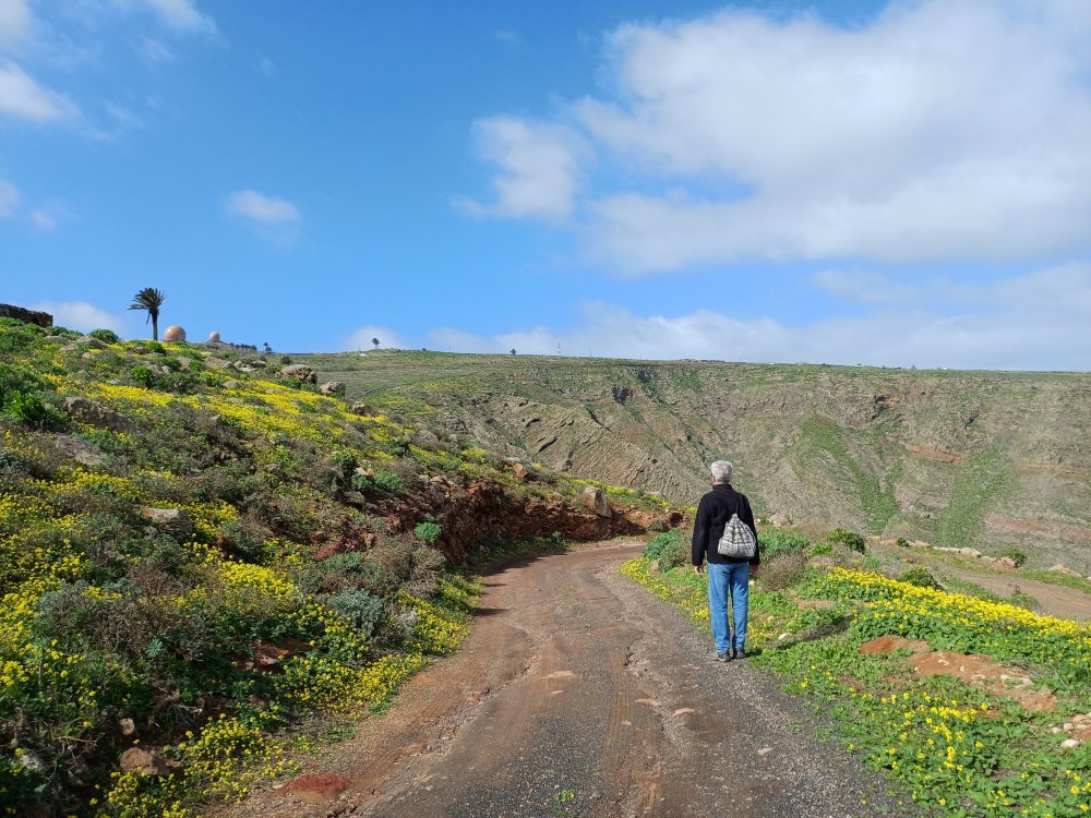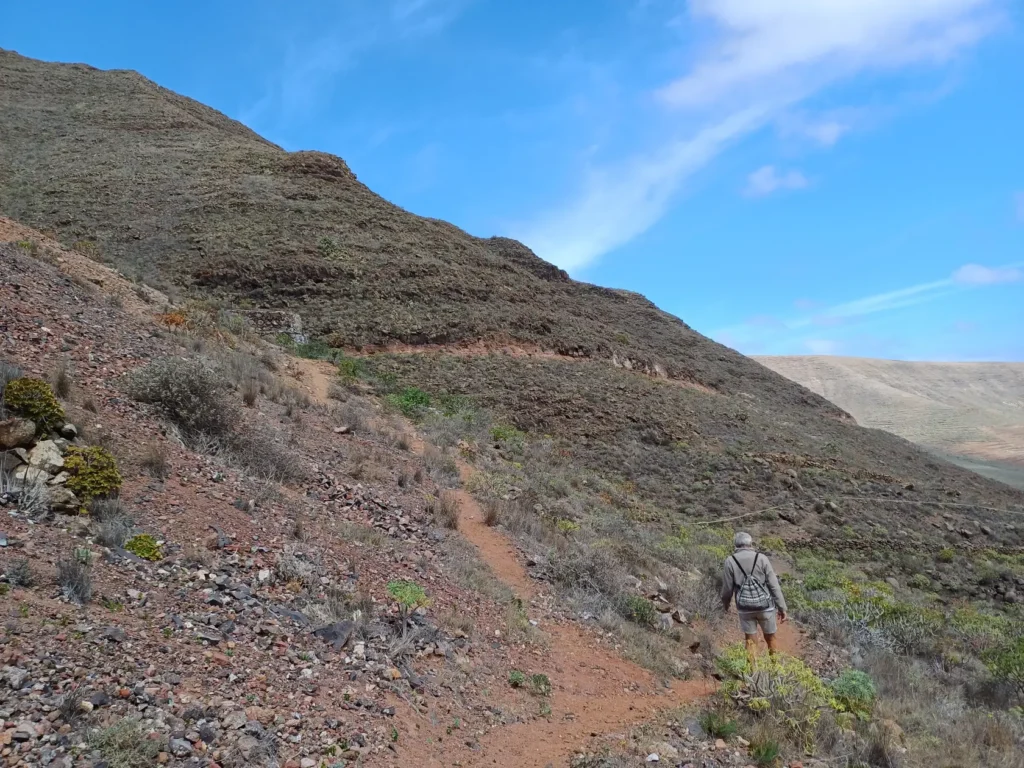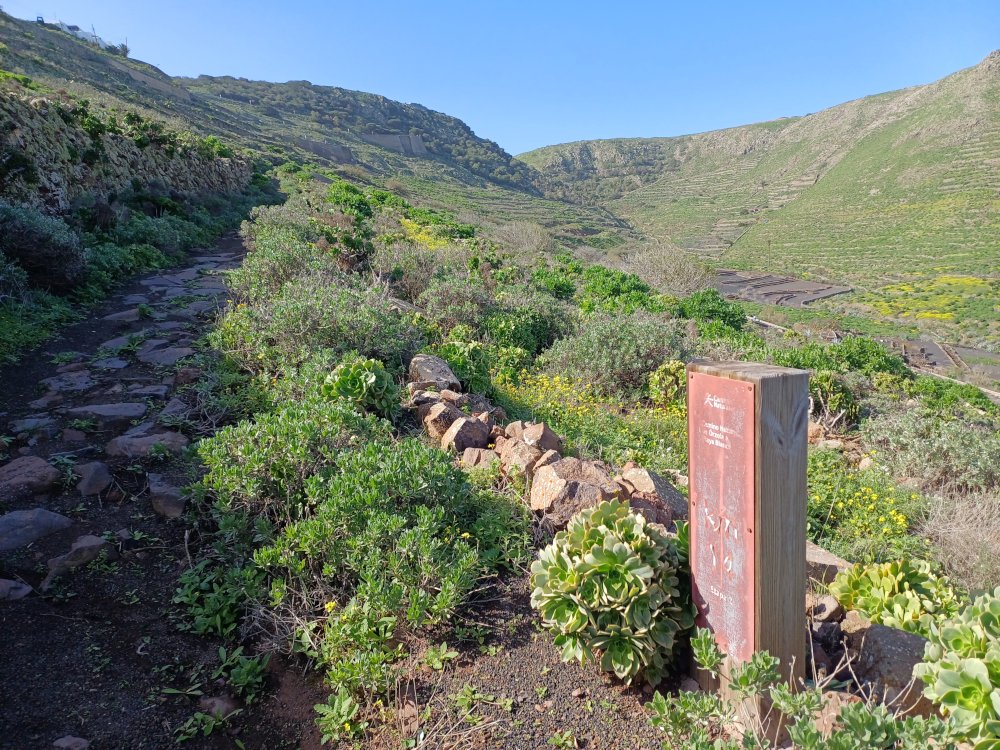 Schräg gegenüber vom Parkplatz geht es auf einem breiten Weg zunächst bergab bis zu einer Kreuzung. Dort links abbiegen und dem Weg aufwärts bis zur nächsten Abzweigung folgen, an der der Weg nach links knickt und es nach rechts auf einen Pfad geht. Dieser Pfad ist der Aufstiegspfad nach Haría, dem wir folgen. In Serpentinen geht es nun weiter bergauf. Der Pfad mündet in der LZ-207, wo wir uns links halten, um in die LZ-210 zu biegen, und dort in die ausgeschilderte Richtung Teguise & Arrecife.