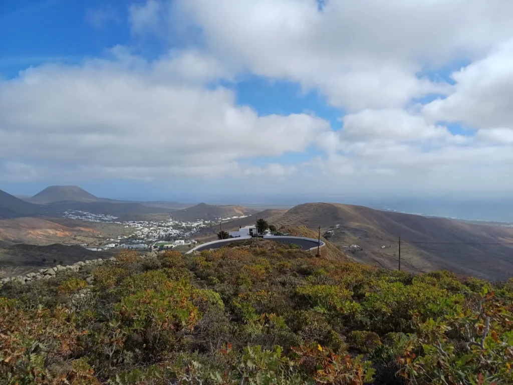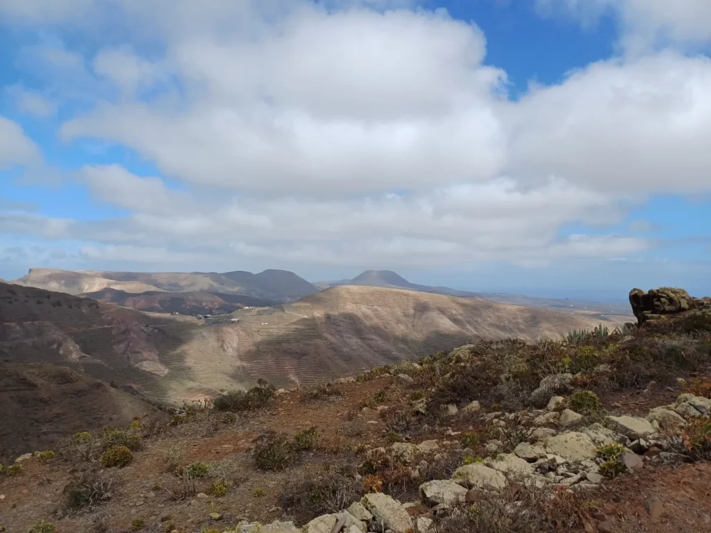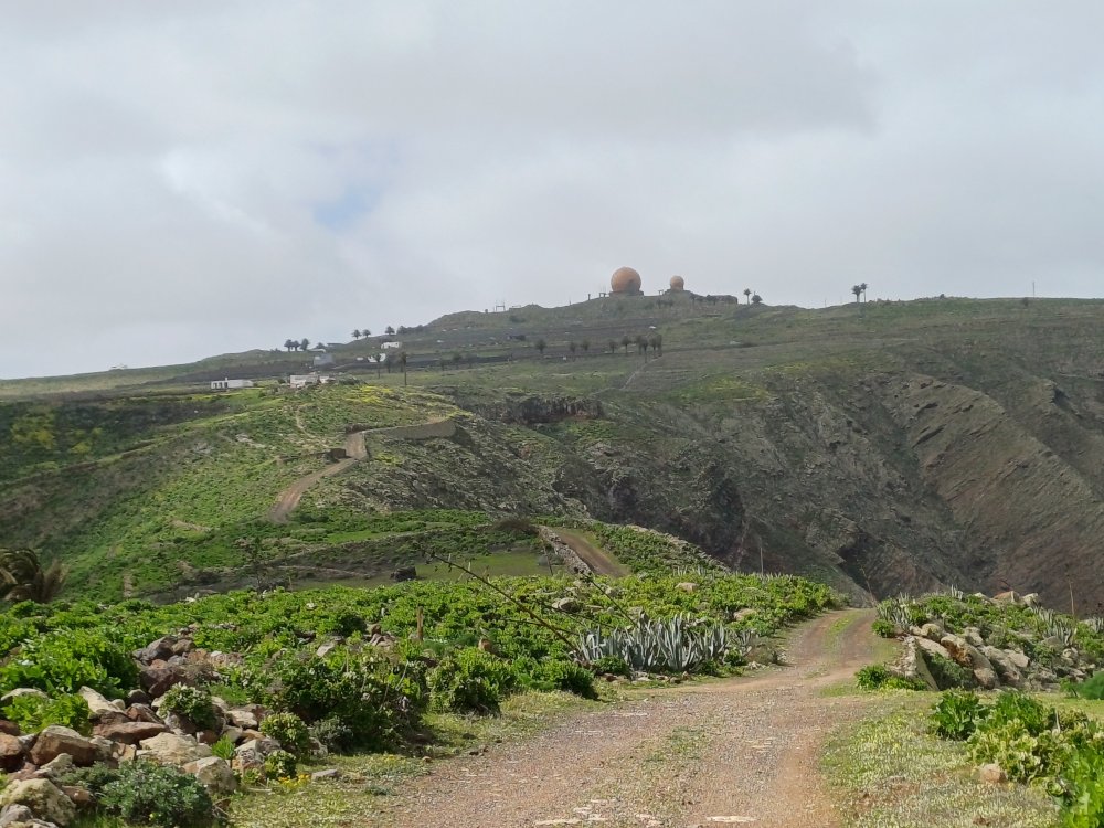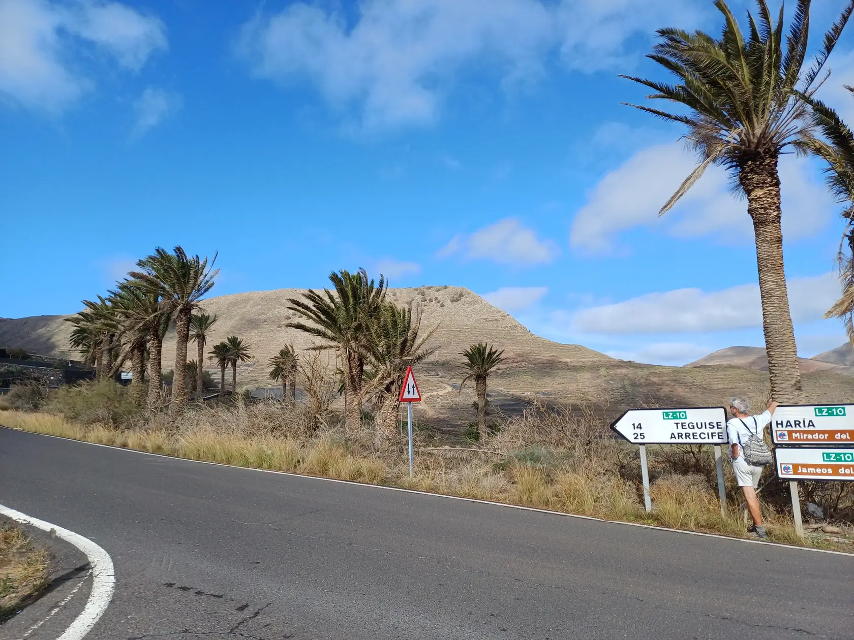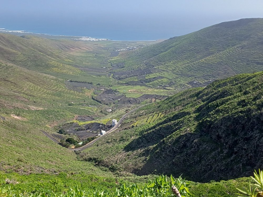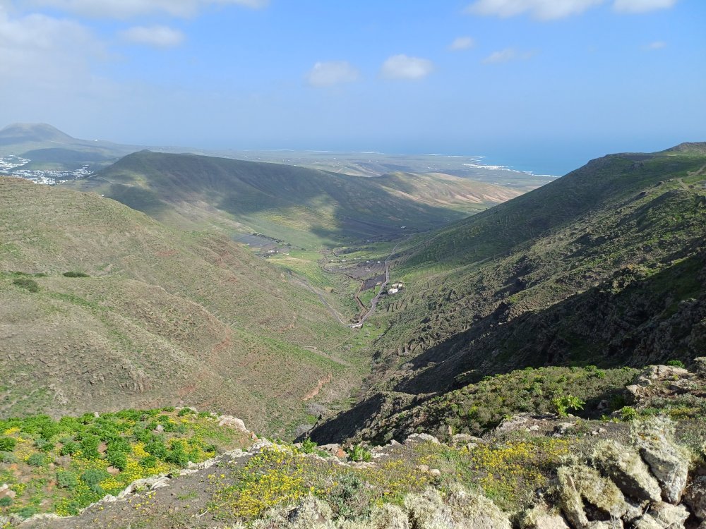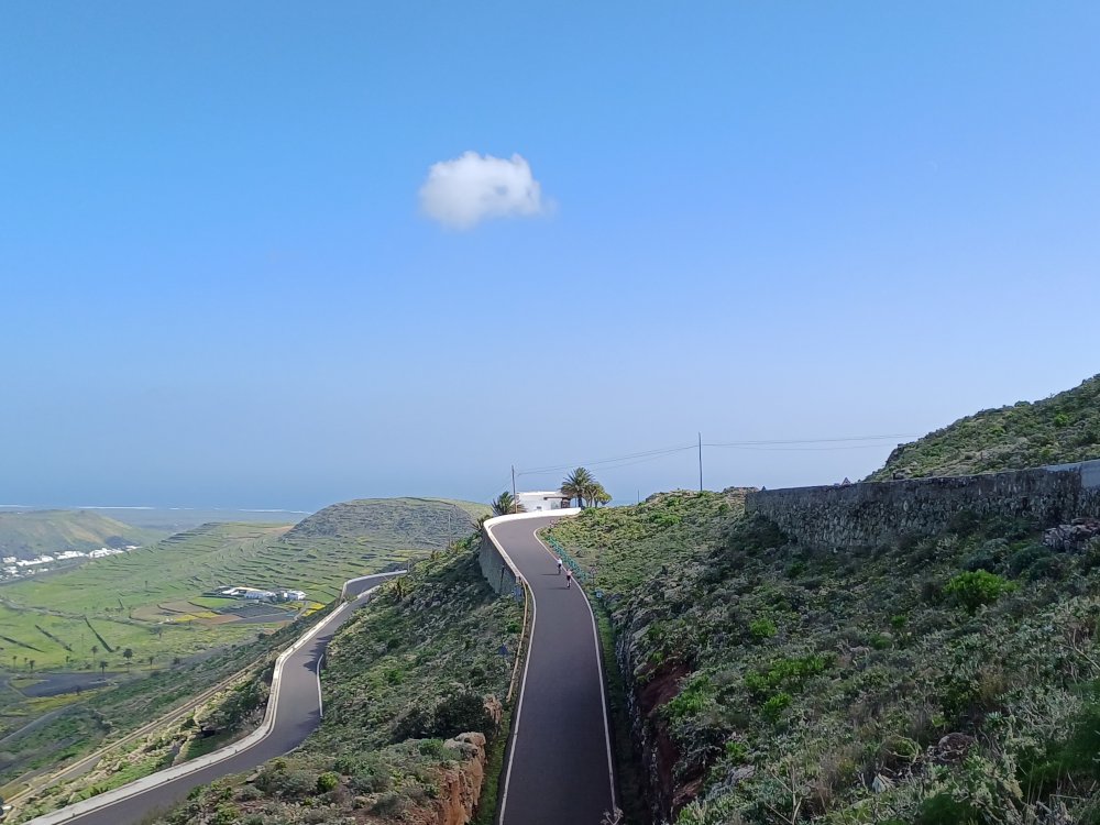 Schräg gegenüber vom Parkplatz geht es auf einem breiten Weg zunächst bergab bis zu einer Kreuzung. Dort links abbiegen und dem Weg aufwärts bis zur nächsten Abzweigung folgen, an der der Weg nach links knickt und es nach rechts auf einen Pfad geht. Dieser Pfad ist der Aufstiegspfad nach Haría, dem wir folgen. In Serpentinen geht es nun weiter bergauf. Der Pfad mündet in der LZ-207, wo wir uns links halten, um in die LZ-210 zu biegen, und dort in die ausgeschilderte Richtung Teguise & Arrecife.