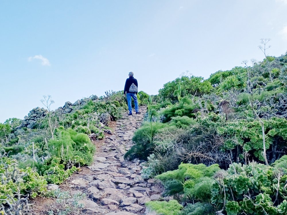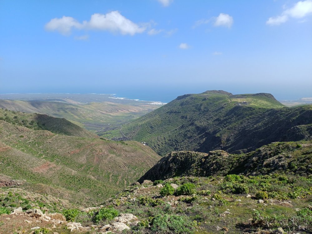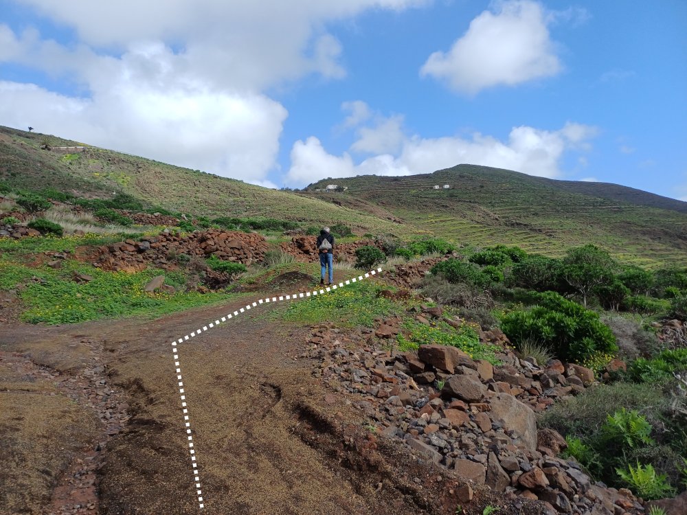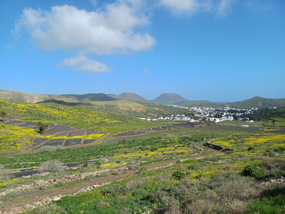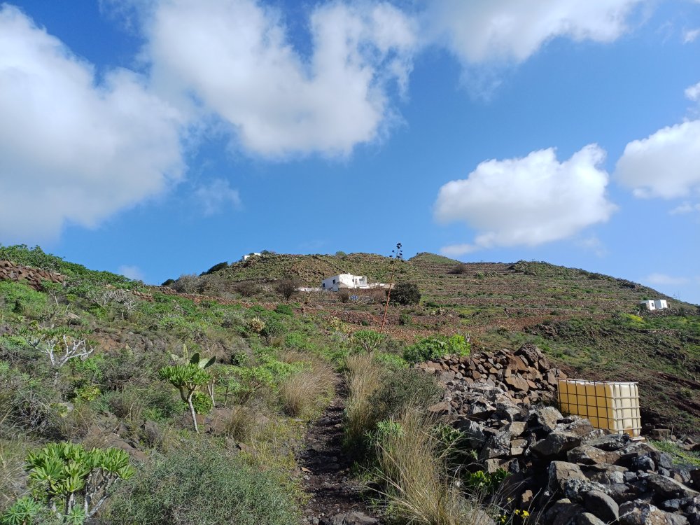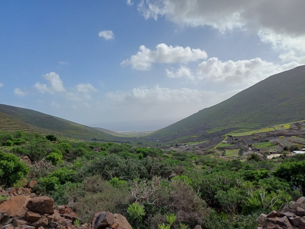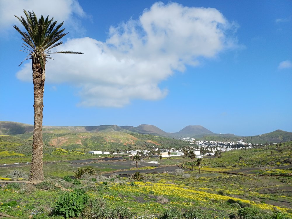 Schräg gegenüber vom Parkplatz geht es auf einem breiten Weg zunächst bergab bis zu einer Kreuzung. Dort links abbiegen und dem Weg aufwärts bis zur nächsten Abzweigung folgen, an der der Weg nach links knickt und es nach rechts auf einen Pfad geht. Dieser Pfad ist der Aufstiegspfad nach Haría, dem wir folgen. In Serpentinen geht es nun weiter bergauf. Der Pfad mündet in der LZ-207, wo wir uns links halten, um in die LZ-210 zu biegen, und dort in die ausgeschilderte Richtung Teguise & Arrecife.