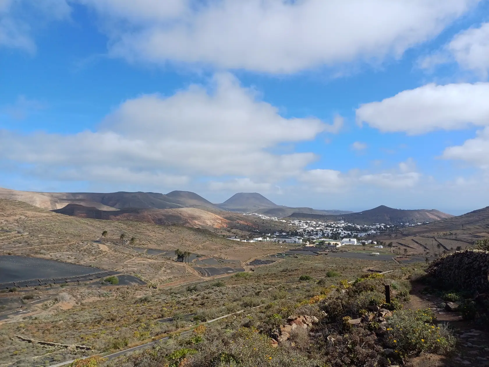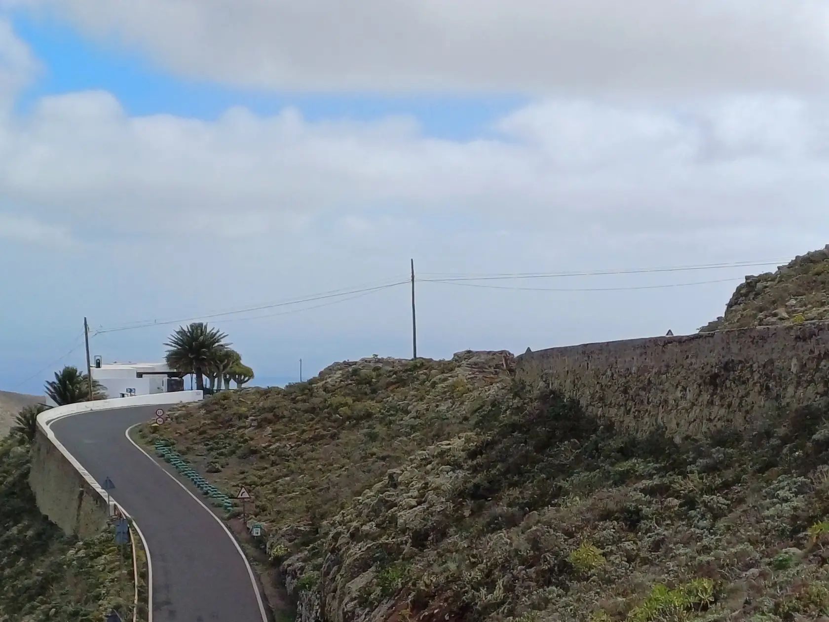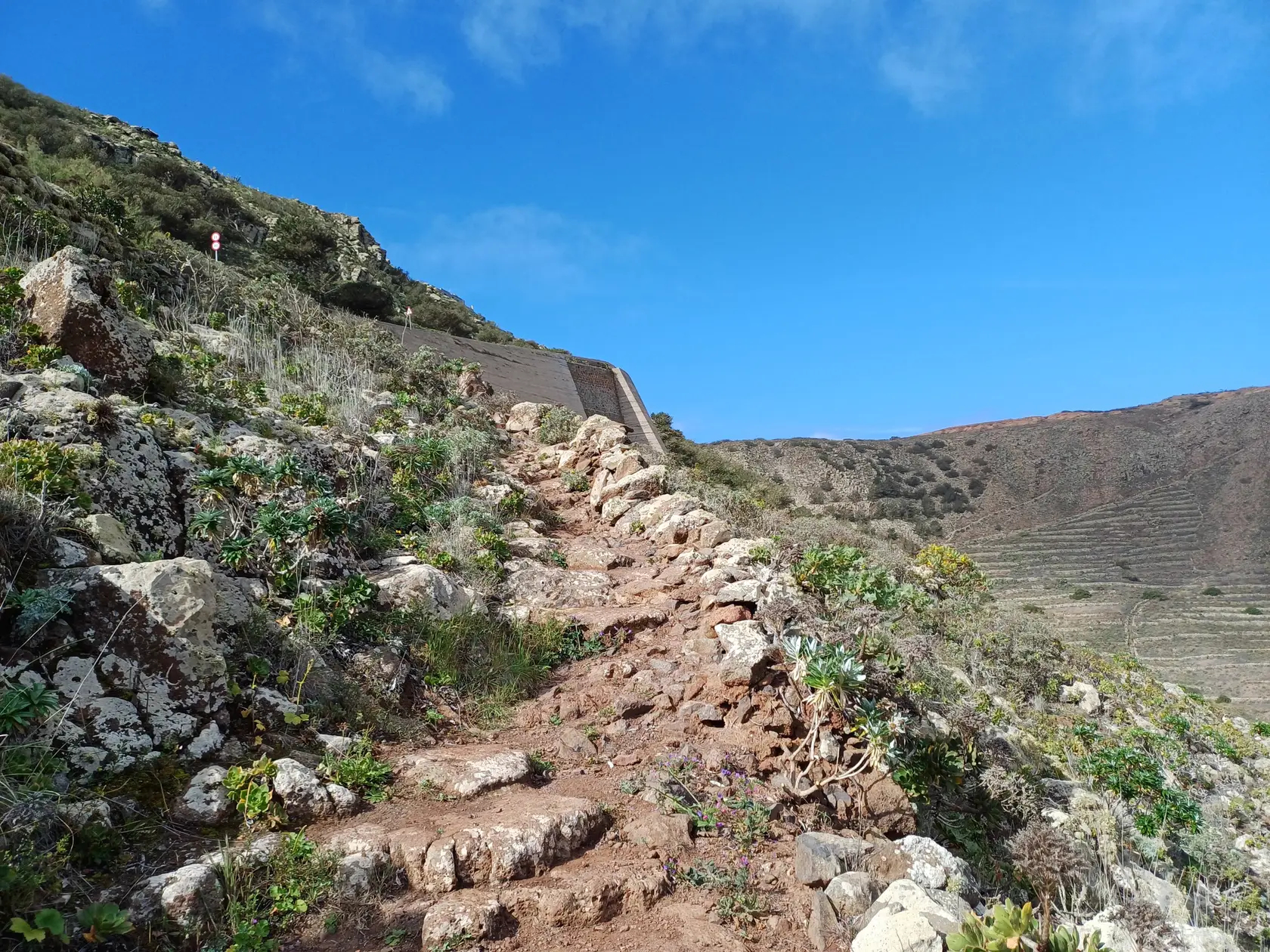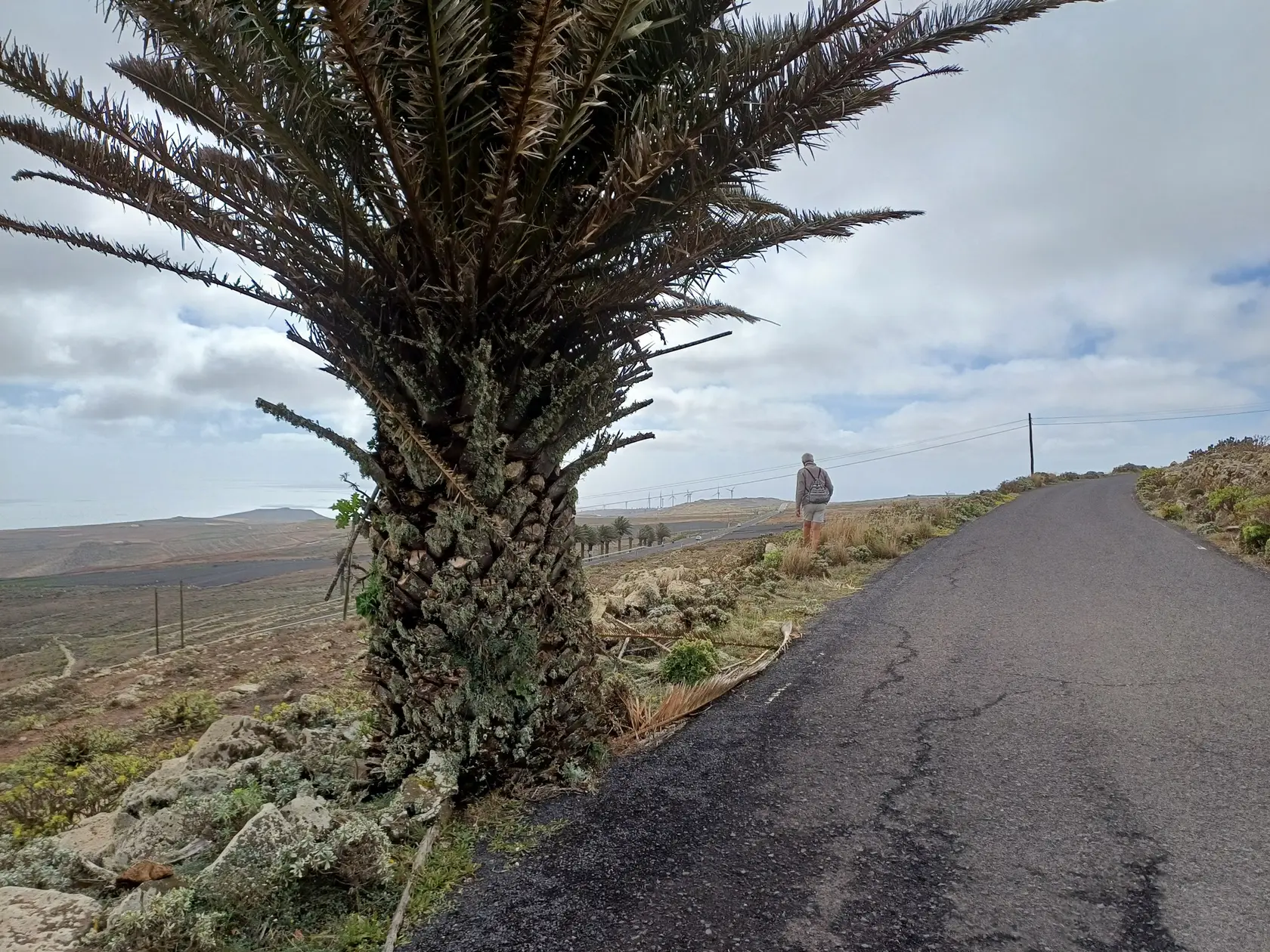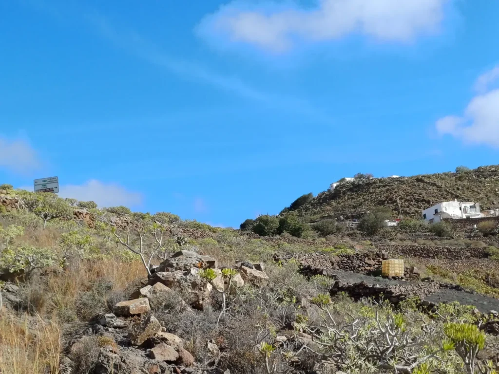 Schräg gegenüber vom Parkplatz geht es auf einem breiten Weg zunächst bergab bis zu einer Kreuzung. Dort links abbiegen und dem Weg aufwärts bis zur nächsten Abzweigung folgen, an der der Weg nach links knickt und es nach rechts auf einen Pfad geht. Dieser Pfad ist der Aufstiegspfad nach Haría, dem wir folgen. In Serpentinen geht es nun weiter bergauf. Der Pfad mündet in der LZ-207, wo wir uns links halten, um in die LZ-210 zu biegen, und dort in die ausgeschilderte Richtung Teguise & Arrecife.