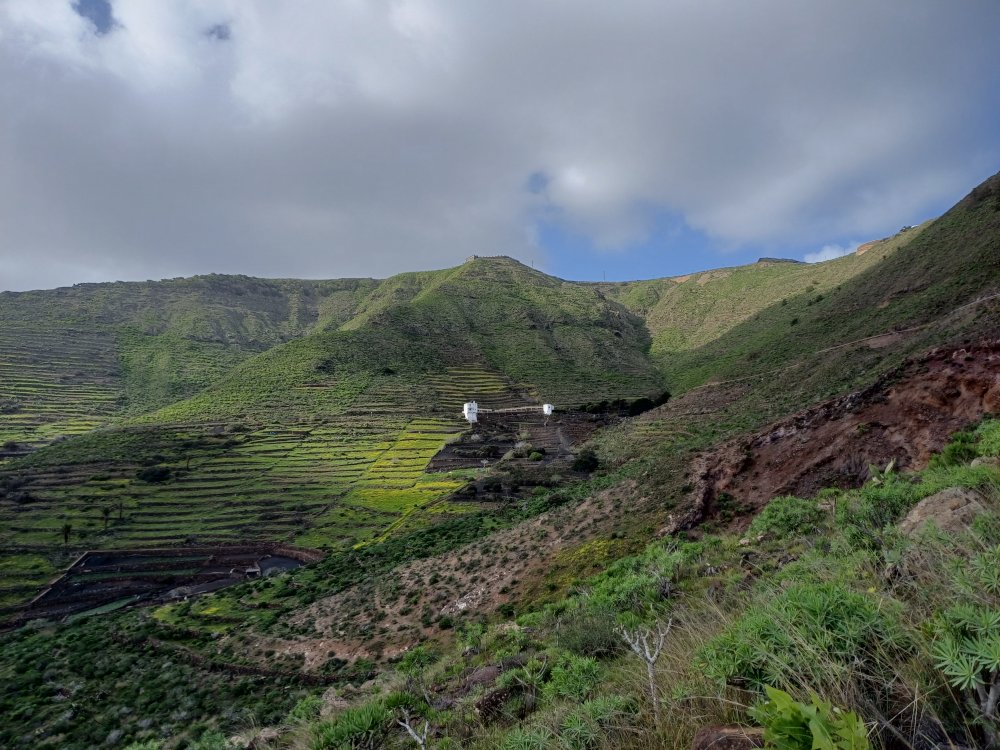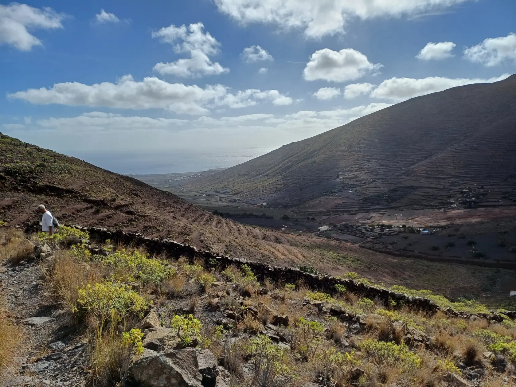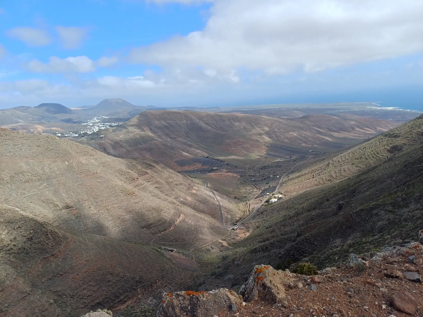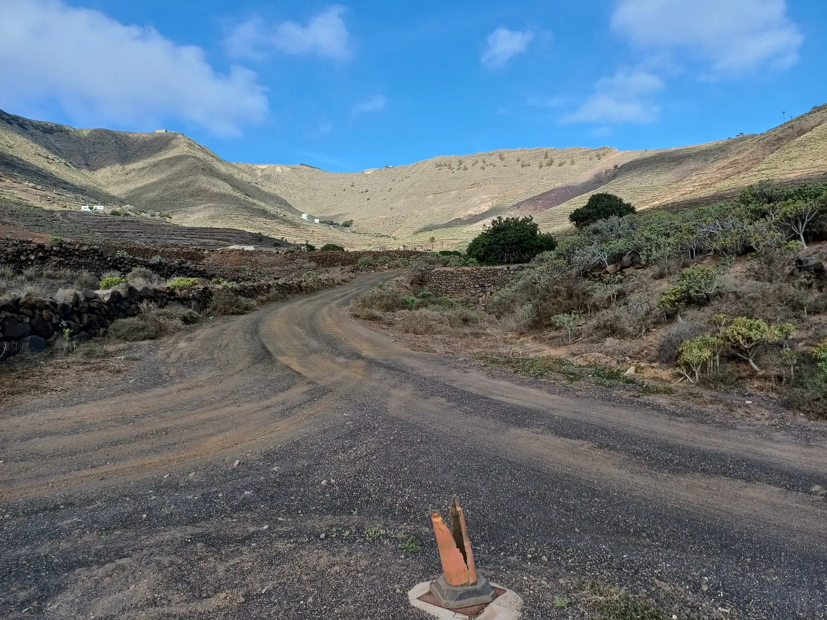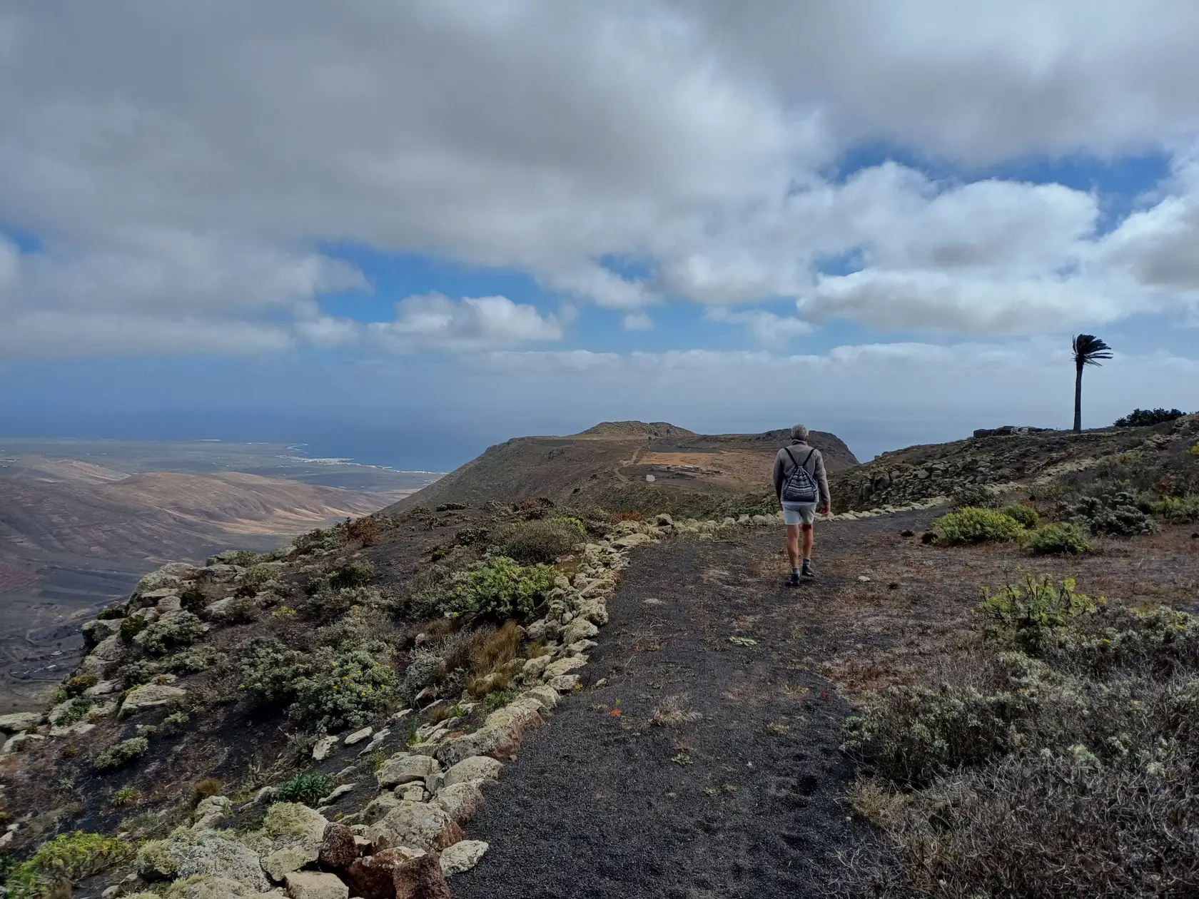 Schräg gegenüber vom Parkplatz geht es auf einem breiten Weg zunächst bergab bis zu einer Kreuzung. Dort links abbiegen und dem Weg aufwärts bis zur nächsten Abzweigung folgen, an der der Weg nach links knickt und es nach rechts auf einen Pfad geht. Dieser Pfad ist der Aufstiegspfad nach Haría, dem wir folgen. In Serpentinen geht es nun weiter bergauf. Der Pfad mündet in der LZ-207, wo wir uns links halten, um in die LZ-210 zu biegen, und dort in die ausgeschilderte Richtung Teguise & Arrecife.