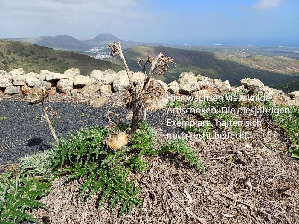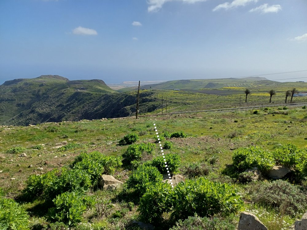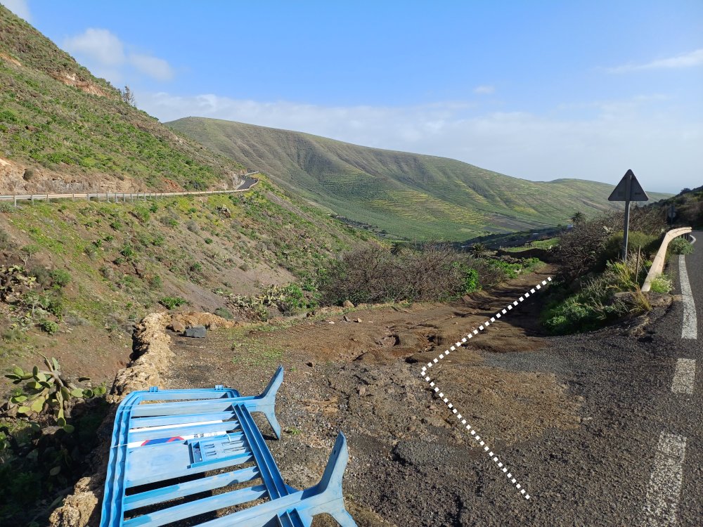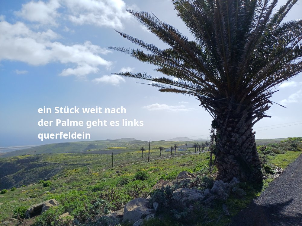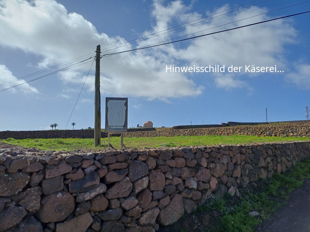 Wir bleiben indes auf dem Weg, der an einer Käserei mit Ziegen und Schafen vorbei führt. Wir haben heute einen kleinen Abstecher dorthin gemacht um zu erfahren, dass es leider keinen Hofladen mehr gibt, sondern der Käse u.a. in Haría auf dem Markt verkauft wird. Hinter dem Abstecher halten wir uns links – also parallel zur LZ-10. Zwischen einer gut sichtbaren Palme und einem Strommast geht es nun – zunächst über große Steine – querfeldein und eine Böschung hinunter zur LZ-10. Diese wird überquert. Sodann wird links der beiden gut zu erkennenden Strommasten über die Leitplanke gestiegen.