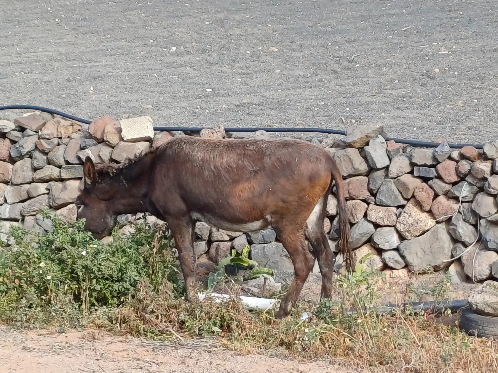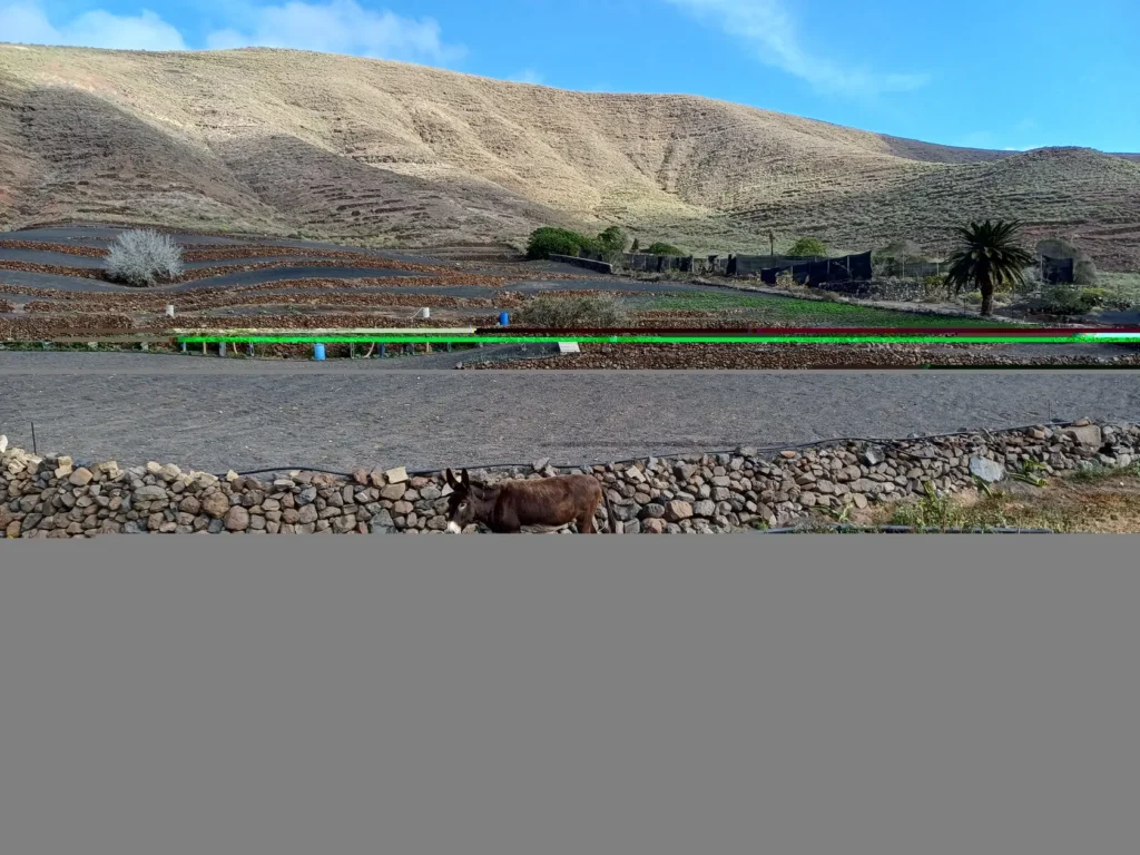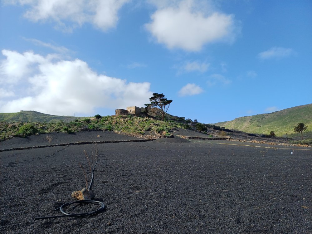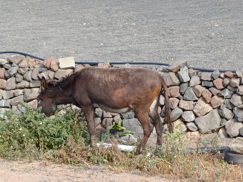 Wir bleiben indes auf dem Weg, der an einer Käserei mit Ziegen und Schafen vorbei führt. Wir haben heute einen kleinen Abstecher dorthin gemacht um zu erfahren, dass es leider keinen Hofladen mehr gibt, sondern der Käse u.a. in Haría auf dem Markt verkauft wird. Hinter dem Abstecher halten wir uns links – also parallel zur LZ-10. Zwischen einer gut sichtbaren Palme und einem Strommast geht es nun – zunächst über große Steine – querfeldein und eine Böschung hinunter zur LZ-10. Diese wird überquert. Sodann wird links der beiden gut zu erkennenden Strommasten über die Leitplanke gestiegen.