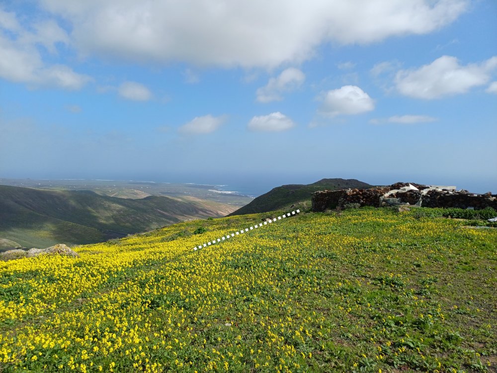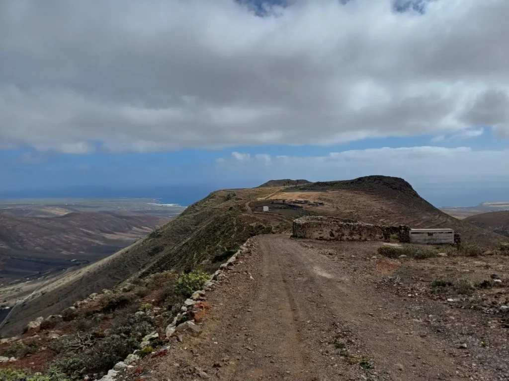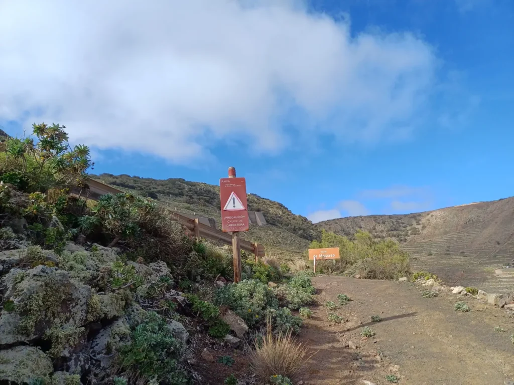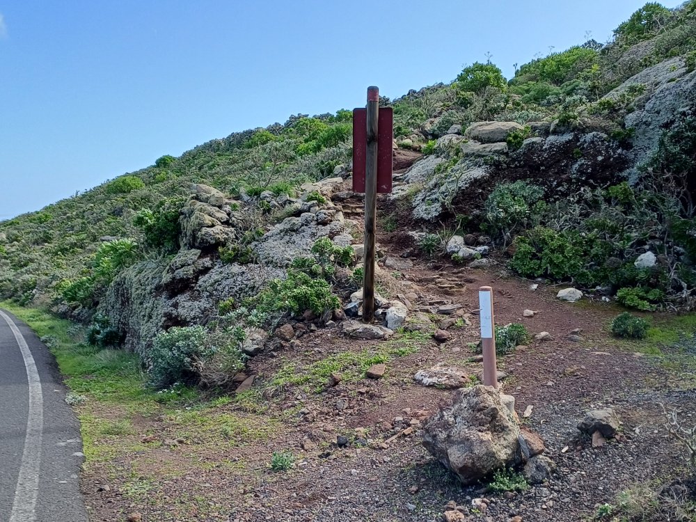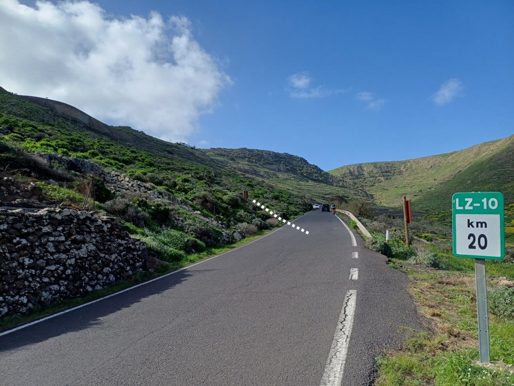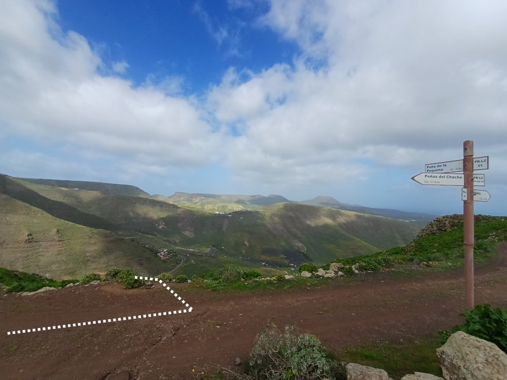 Nach kurzer Gehzeit kreuzt hinter einem grünen LZ-10-Straßenschild ein offizieller Wanderweg die Straße, in den wir links biegen und der stets aufwärts führt und dabei mehrfach die LZ-10 kreuzt. An einer der Wegkreuzungen kann auf der Straße ein Abstecher zum gut sichtbaren „Mirador de Haría“ gemacht werden, der von Di-Sa von 9 – 17 h geöffnet ist (Beschreibung und Bilder gibt es im 3. Abschnitt dieser Wanderung). Oberhalb des Miradors wird nochmals die LZ-10 gekreuzt. Dort beginnt ein breiter Weg.