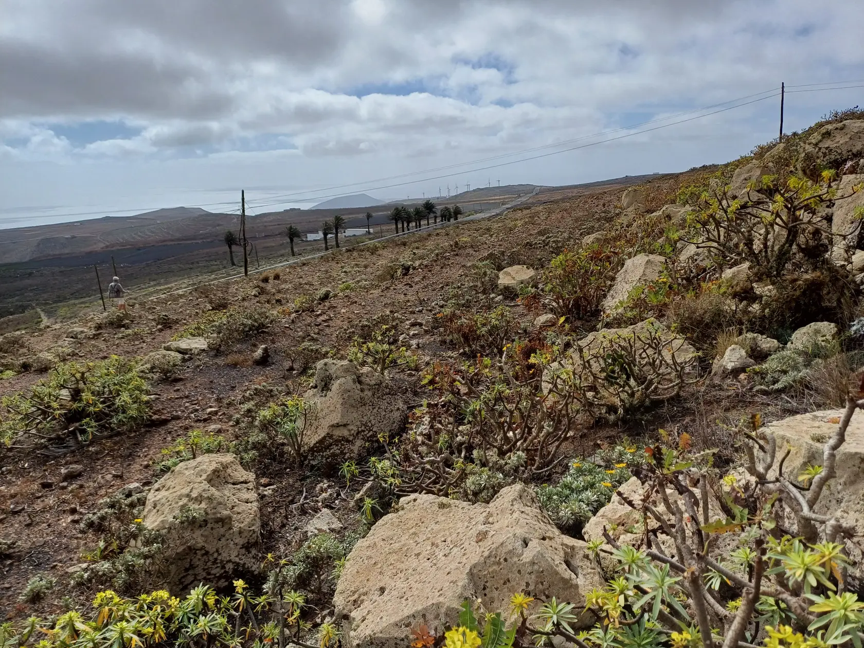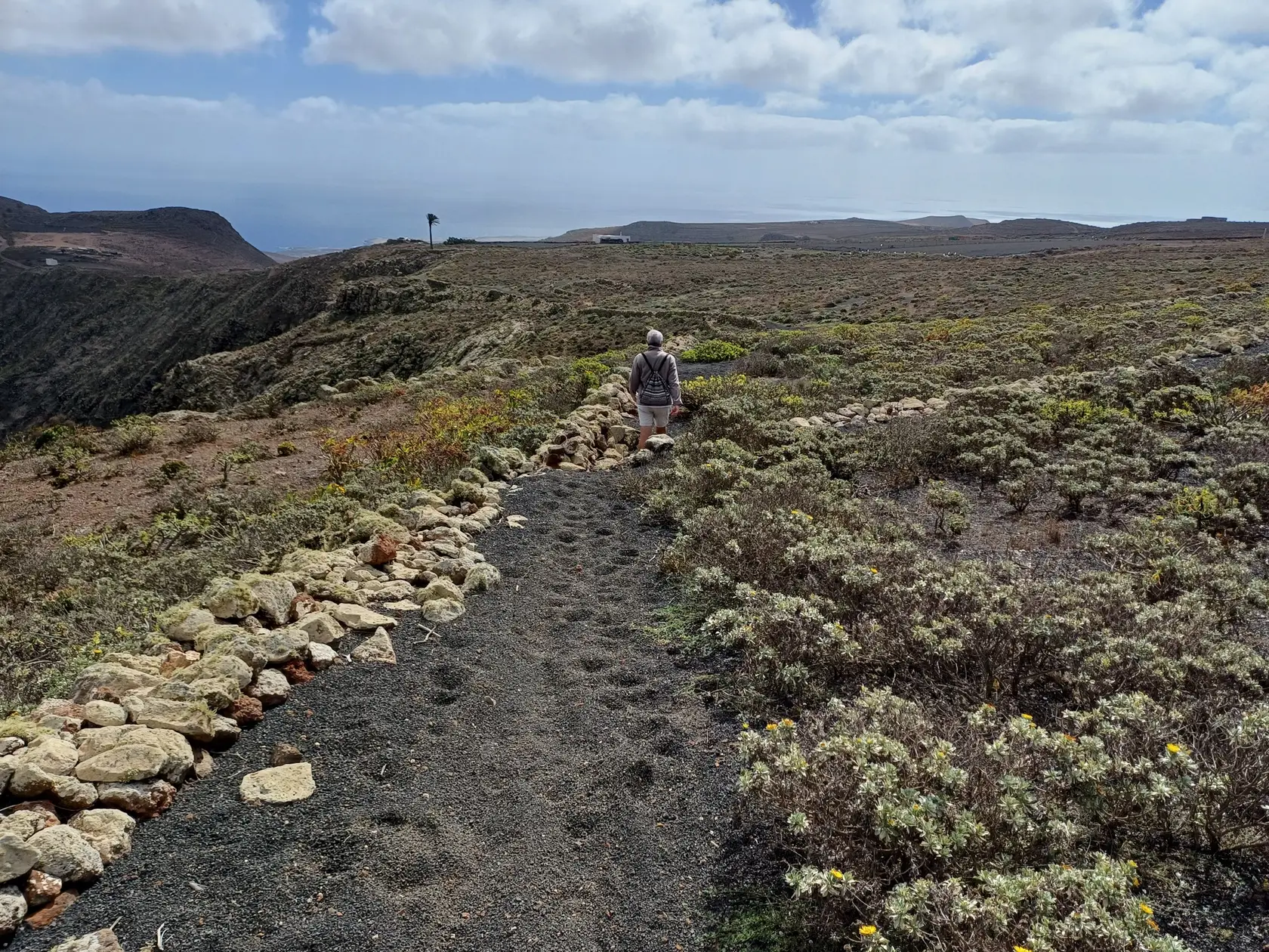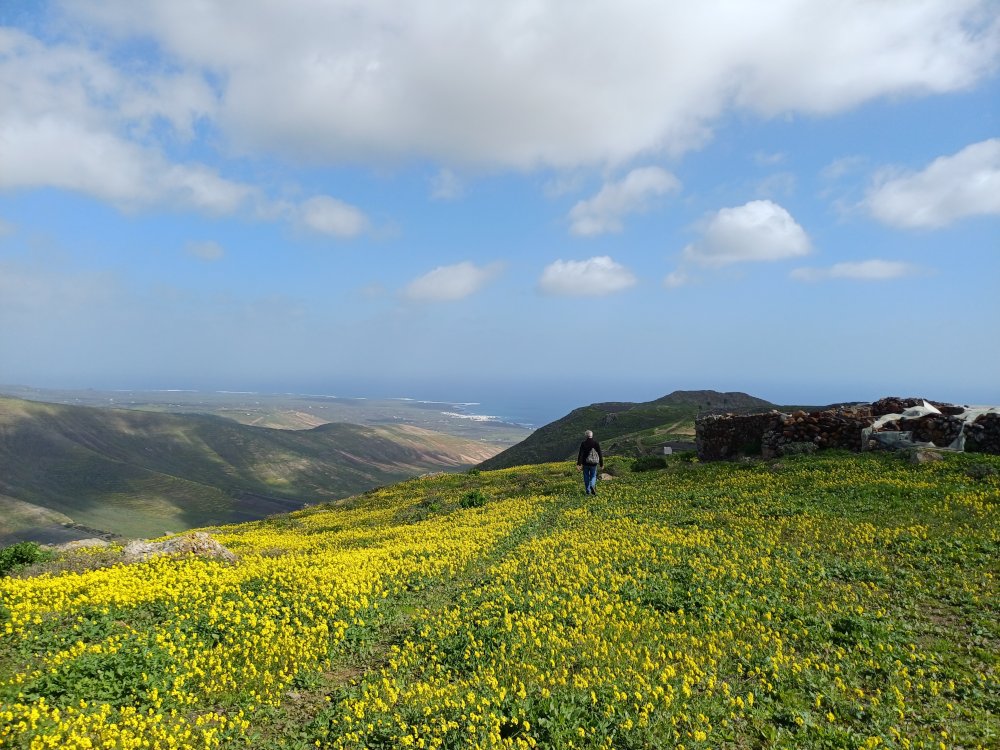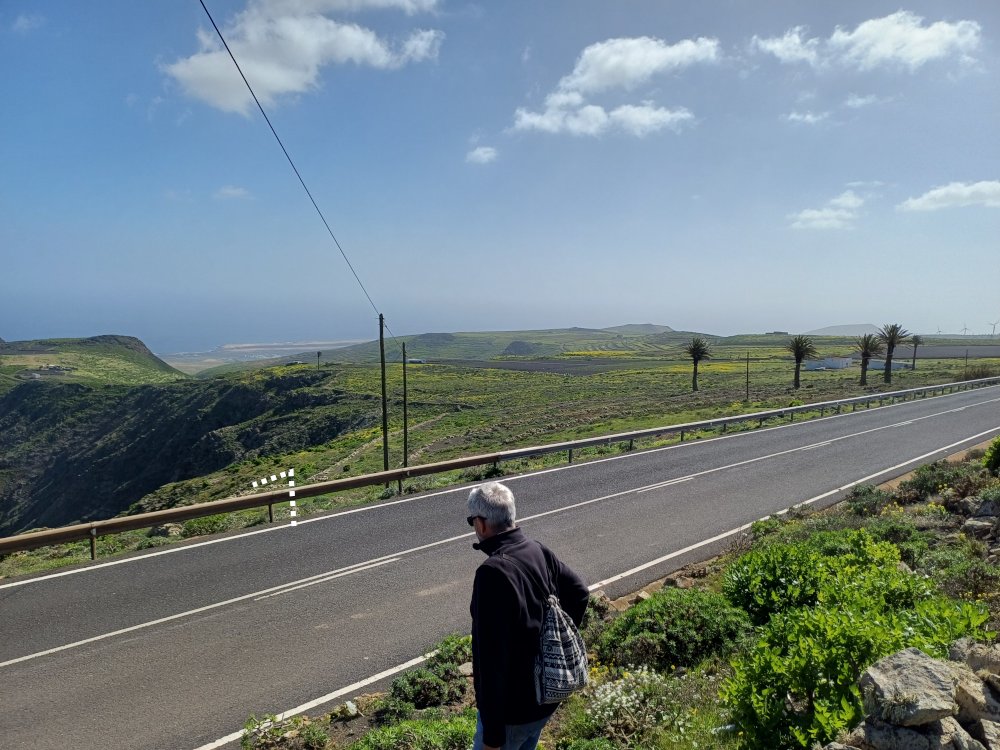 Nach kurzer Gehzeit kreuzt hinter einem grünen LZ-10-Straßenschild ein offizieller Wanderweg die Straße, in den wir links biegen und der stets aufwärts führt und dabei mehrfach die LZ-10 kreuzt. An einer der Wegkreuzungen kann auf der Straße ein Abstecher zum gut sichtbaren „Mirador de Haría“ gemacht werden, der von Di-Sa von 9 – 17 h geöffnet ist (Beschreibung und Bilder gibt es im 3. Abschnitt dieser Wanderung). Oberhalb des Miradors wird nochmals die LZ-10 gekreuzt. Dort beginnt ein breiter Weg.