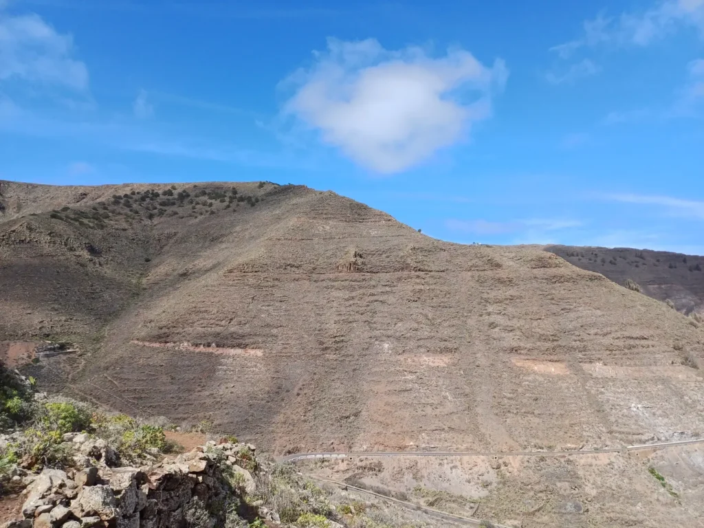 Der Pfad verläuft unterhalb des Wasserbeckens „Fuente de Chafariz“, das aus der Vogelperspektive gut zu erkennen ist und auf unserer heutigen Tour randvoll mit Wasser war. Diesmal haben wir keinen Abstecher dorthin gemacht. Wer das Wasserbecken und die darüber liegende „Galería“ besichtigen möchte, biegt hinter einem mit grobem Schotter bedeckten Abhang in den gut sichtbaren Pfad links ab. Beschreibung und Fotos des Beckens und der „Galería“ gibt es auf dieser Wanderung.