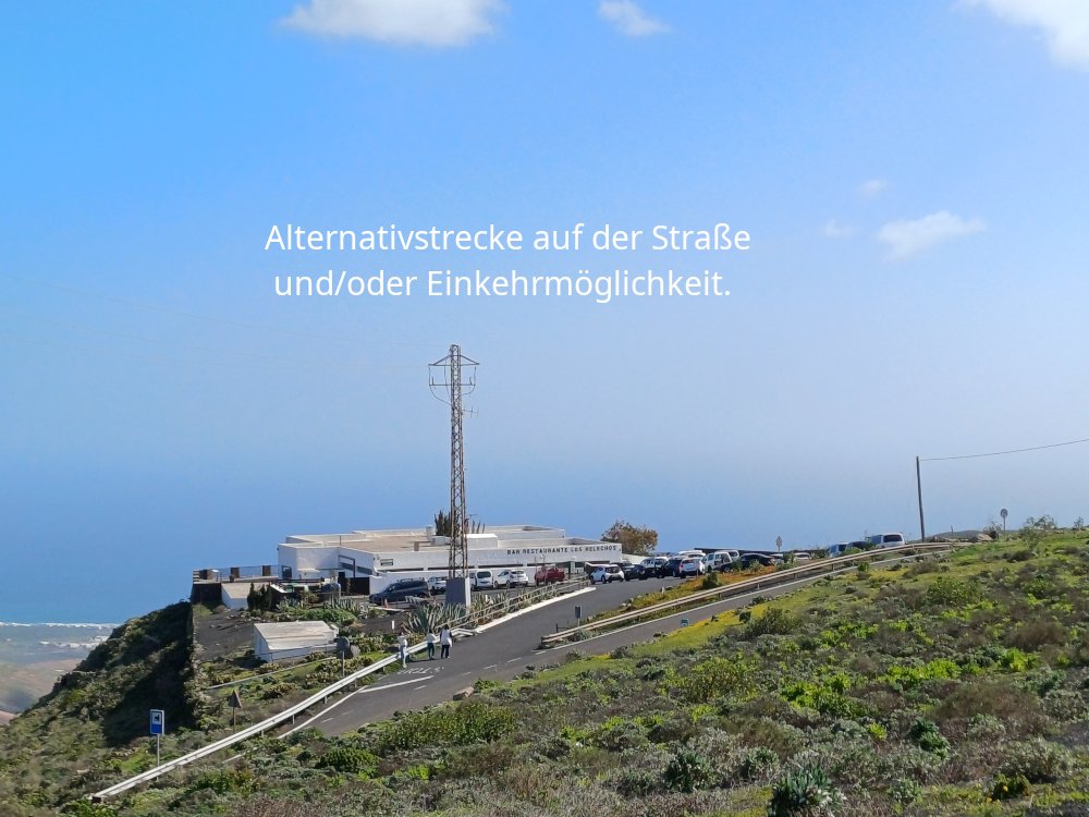 Via Abzweigung kann auf die LZ-10 gegangen werden, um die Alternative ohne Querfeldeinabschnitt zu gehen: Der LZ-10 wird Richtung Restaurant „Los Helechos“ gefolgt. Weiter am Restaurant vorbei bis links eine Leitplanke beginnt, hinter der 2 Strommasten gut zu erkennen sind. Steigen Sie nach wenigen Metern über die Leitplanke, und bleiben Sie dabei links von den beiden Strommasten. Nun geht es wie unten beschrieben weiter.