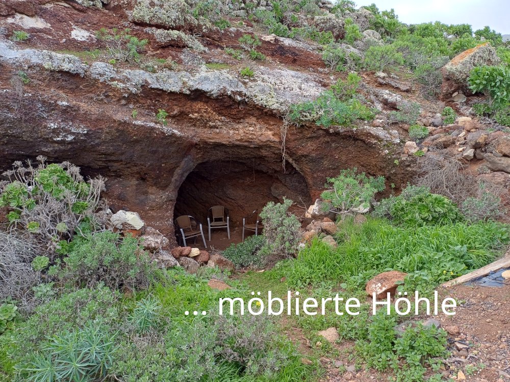 Am Pfosten mit Hinweisschildern biegen wir nach links auf einen Pfad (also Richtung Ausschilderung „Peña de la Pequena“), der zunächst an einer „möblierten“ Höhle und sodann die Schlucht hinab führt. Da in großen Serpentinen auf einem gut ausgetretenen, traditionellen Pfad gegangen wird, ist der Abstieg recht bequem zu gehen und überhaupt nicht so steil, wie von oben aus betrachtet zu vermuten ist. Flora-Freunde kommen hier besonders auf ihre Kosten.